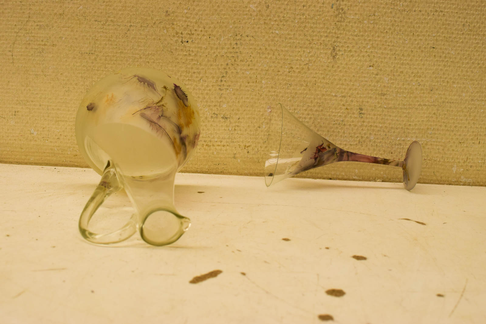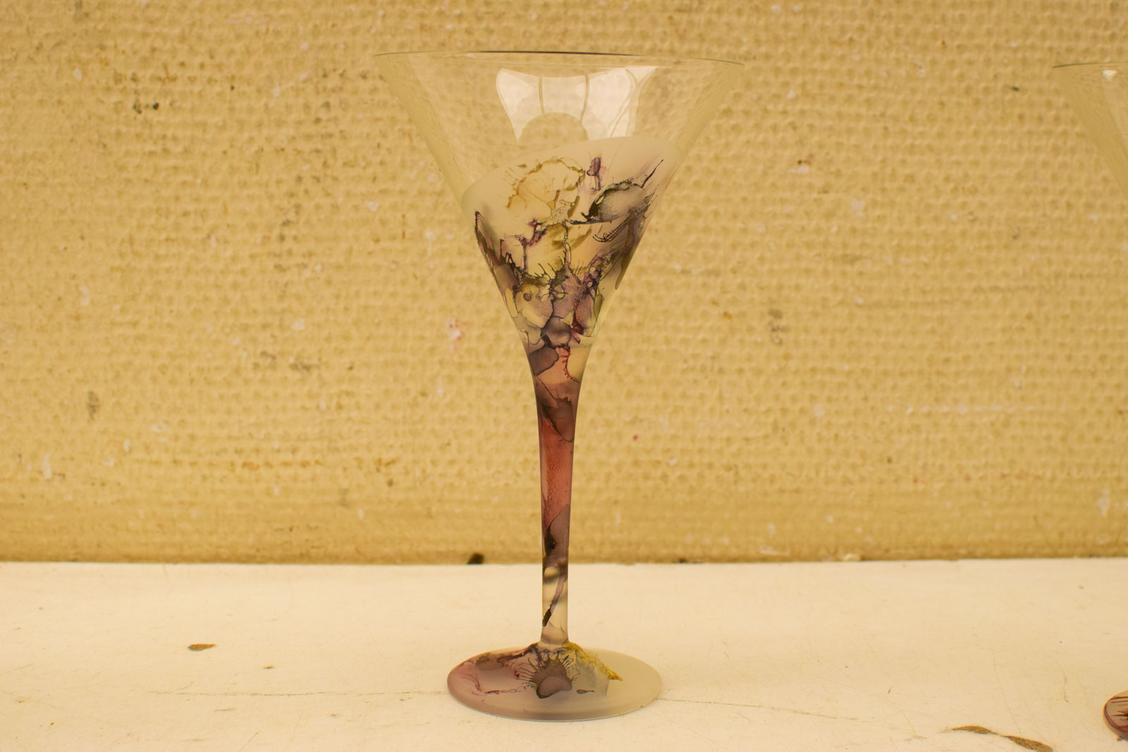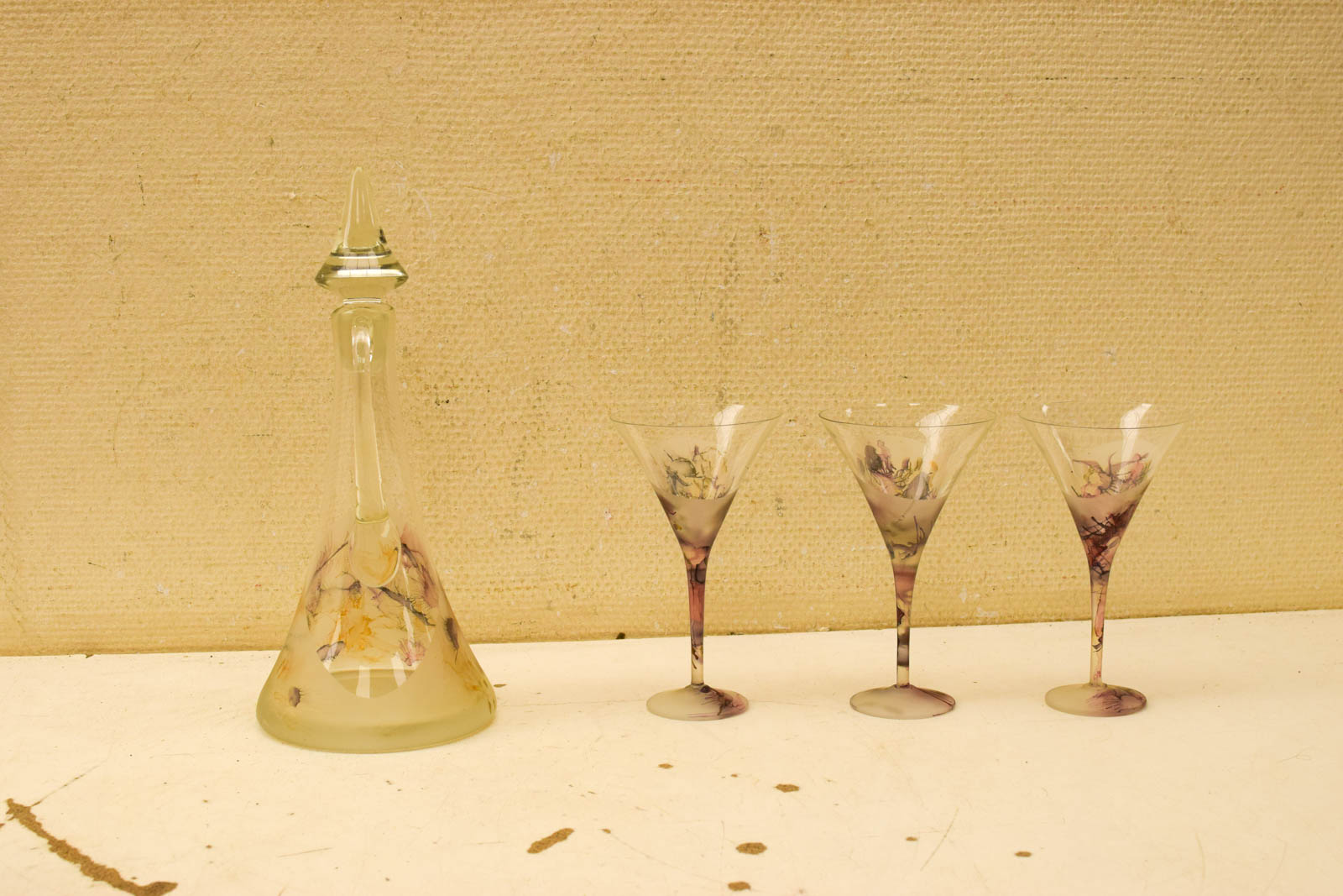 De karaf is hoog 32 cm bij een breedte en diepte van elk 14 cm. De individuele cocktailglazen hebben een bovenmaat van 10 cm diameter en zijn 17,5 cm hoog. Het glas is heel en intact, maar vertoont wel de gebruikssporen van de jaren: kleine krassen, lijntjes in het glas en verkleurde plekken die wijzen op ouderdom en gebruik.