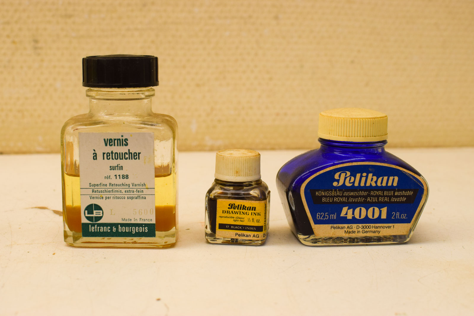 Set van 5 gebruikte Pelikan inktpotjes in verschillende soorten: 2x Pelikan 4001 donkerblauw, zwarte inkt, India inkt en retoucheervernis. Alle potjes zijn niet meer vol.