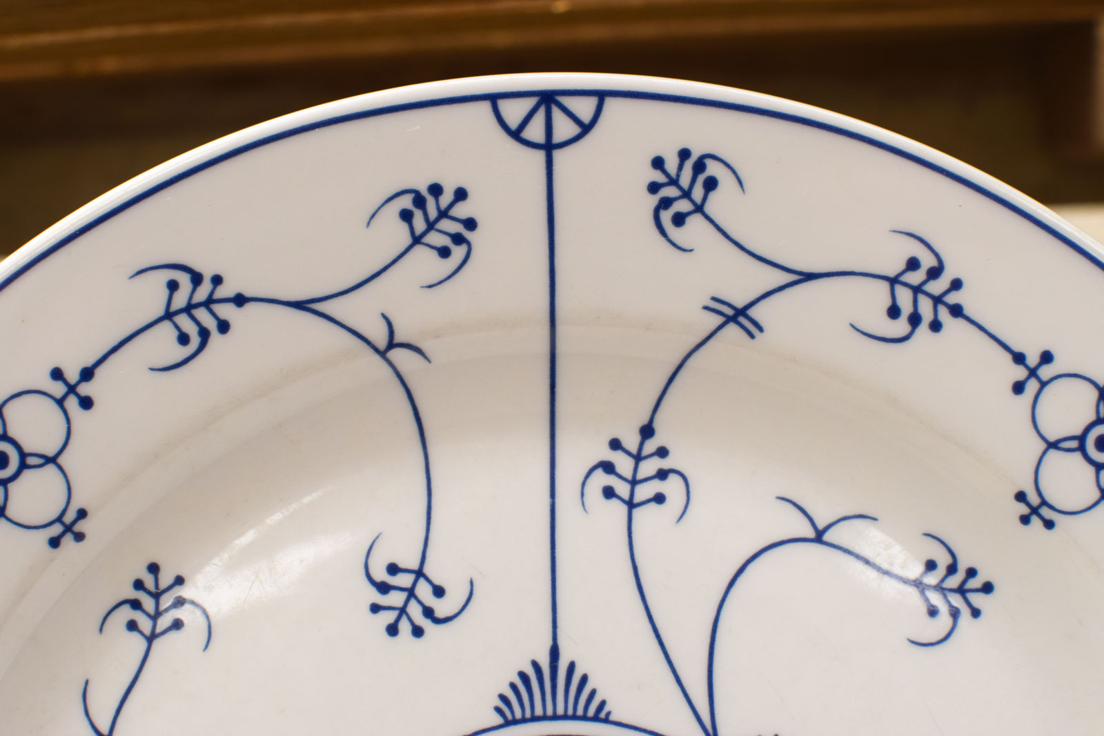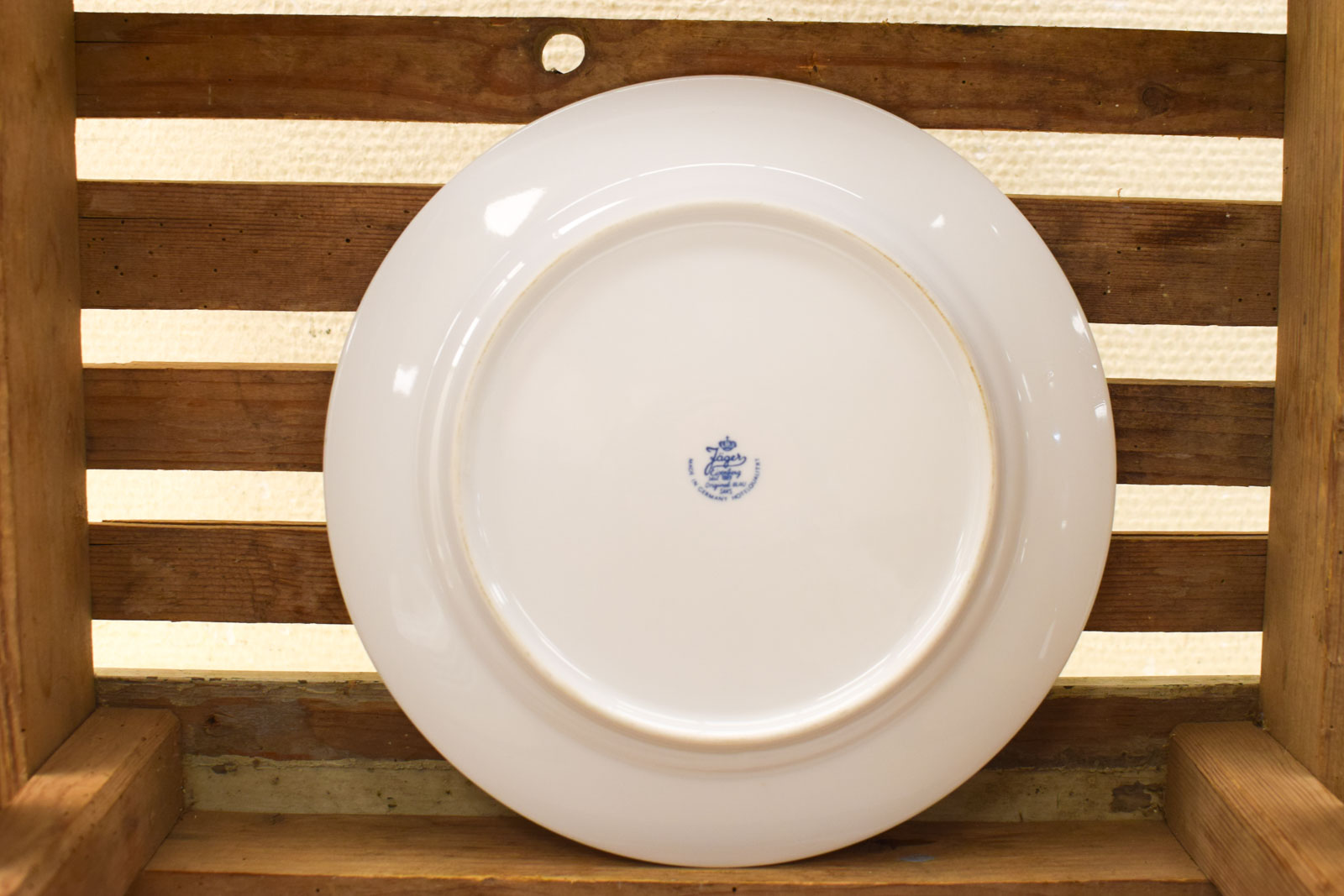 Dit zijn 5 porseleinen borden van het Duitse merk Jäger Eisenberg, bekend om fijn porselein met klassieke motieven. De borden hebben een doorsnee van 25 centimeter en zijn voorzien van een sierlijk blauw bloemdessin. Het patroon bestaat uit slingerend rankenwerk met bloemtakken rondom een centraal medaillon met geometrische bloemmotieven.