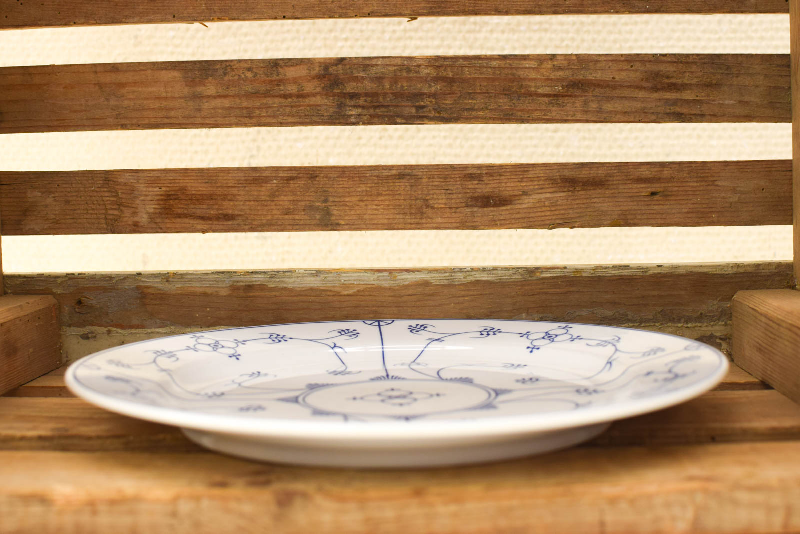 De borden vertonen gebruikssporen en krassen die passen bij hun leeftijd en gebruik. Ze zijn nog heel en functioneel. Het blauwe decor is over het geheel goed zichtbaar, al geeft het oppervlak blijk van normale slijtage.