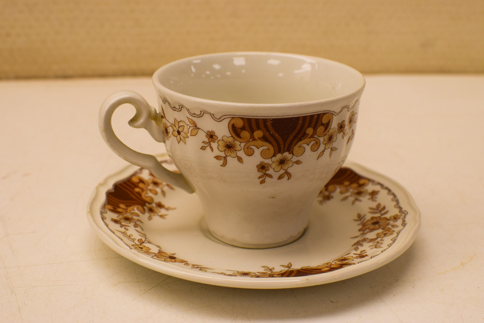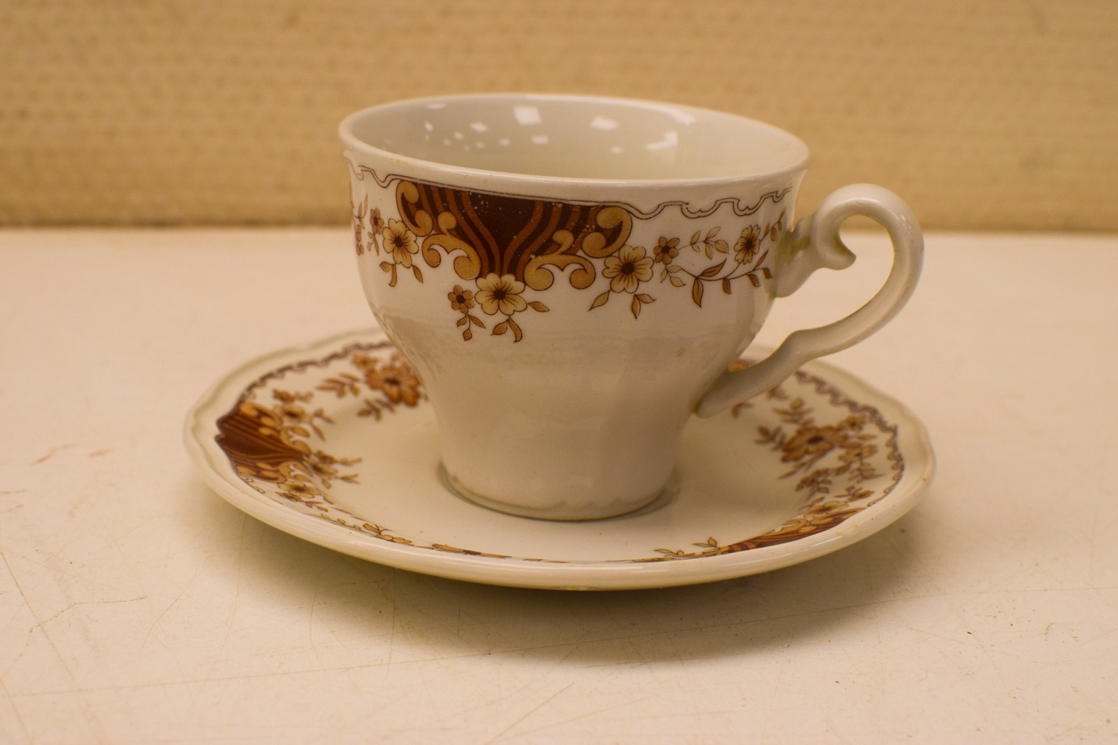 het kopje gemeten diameter bovenkant opening 7,5 cm hoog 6 cm diameter van het schaaltje 12,5 cm het servies heeft krasjes