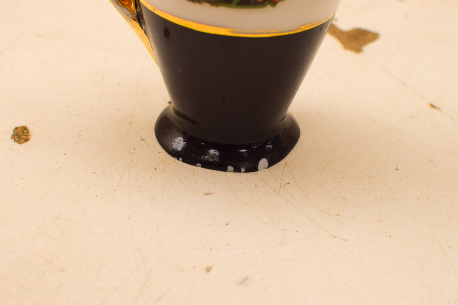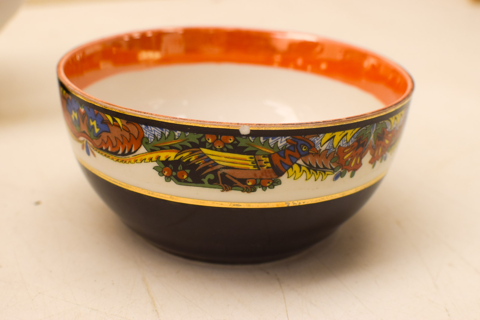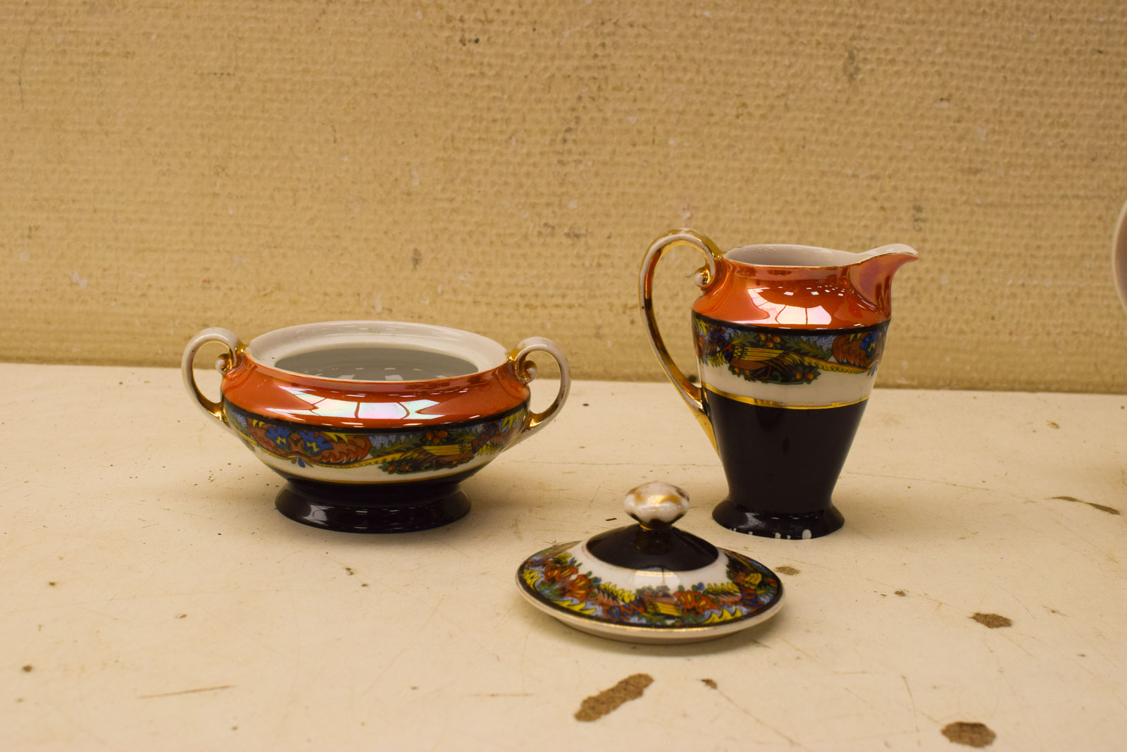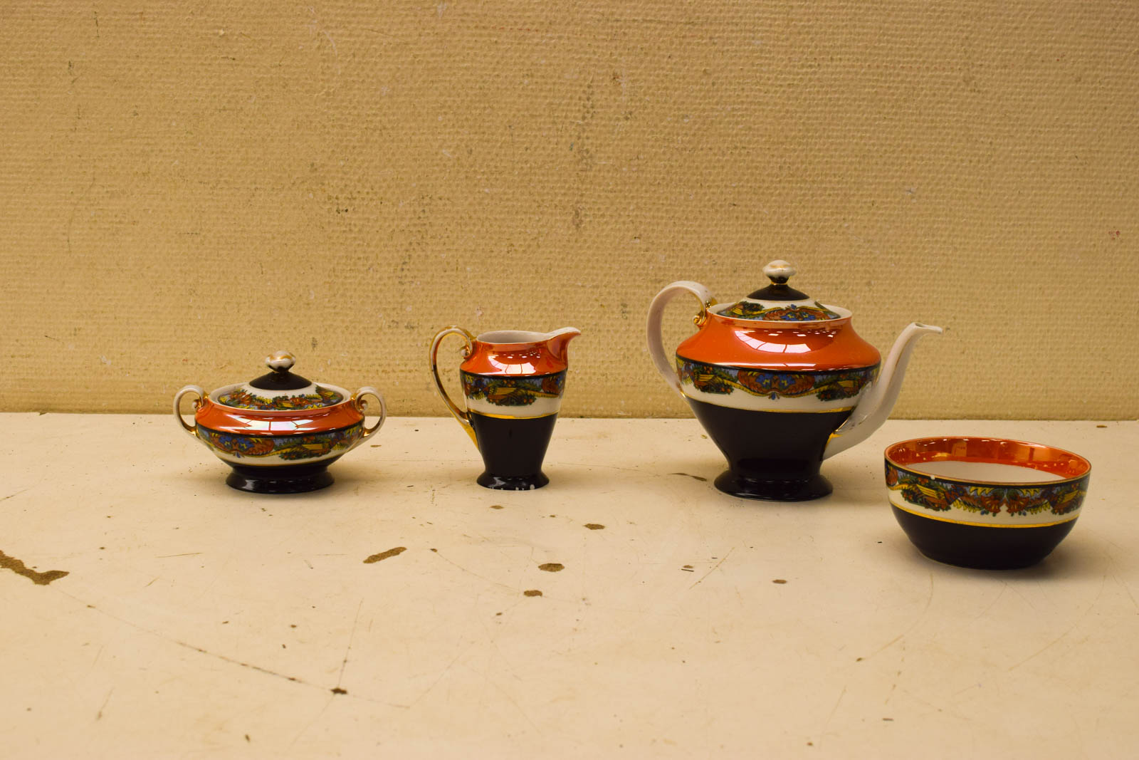 Dit is een 6-delig servies van Bavaria Tirschenreuth (modelnummer 50784), een Duitse fabrikant van keramiek en porselein met een rijke geschiedenis. Het servies dateert uit een periode waarin art deco design populair was, zichtbaar in het kenmerkende zwart-oranje kleurschema met gedetailleerde decoratieve sliertjes en vogelornament op een crèmekleurige band.
