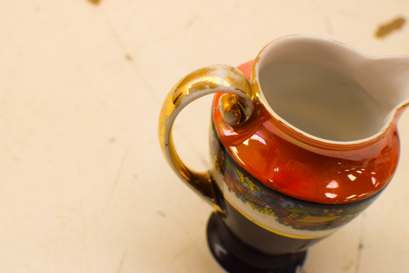 Het servies bestaat uit een theepot, melkkannetje, suikerpotje en een diepere schaal, elk met karakteristieke handvatten en accenten in goud. De theepot meet van tuit tot oor 21 centimeter en is zonder deksel 13,5 centimeter hoog. Het melkkannetje is 10,5 centimeter hoog met een tuitbreedte van 10 centimeter. Het suikerpotje meet 13,5 centimeter breed en zonder deksel 6 centimeter hoog. De schaal heeft een diameter van 12 centimeter aan de bovenste opening en is 6 centimeter hoog.