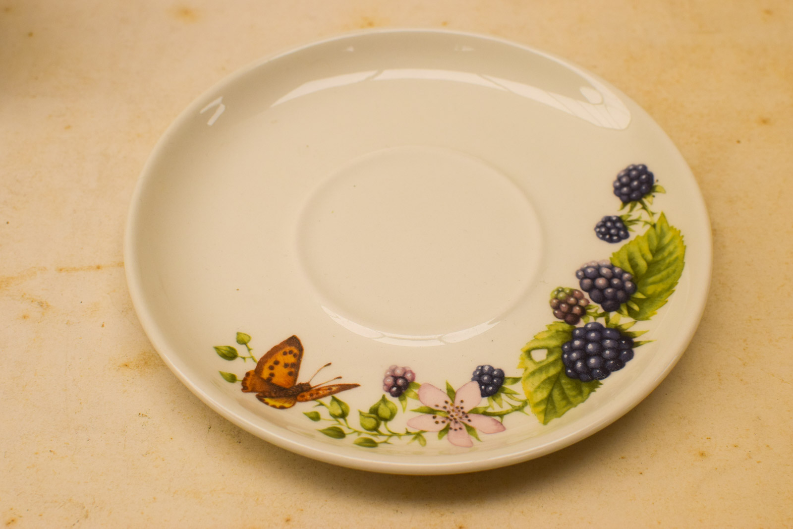 met bloem en vlinder print alle 3 de kopjes en schoteltjes hebben een andere prent diameter van de bovenkant opening van het kopje 7,5 cm hoog 5,5 cm diameter van het schaaltje 14 cm hebben lichte krasjes
