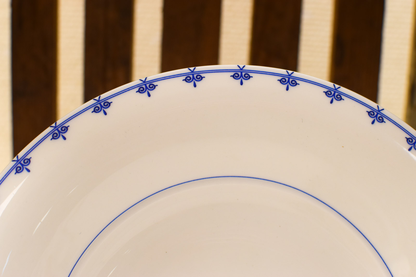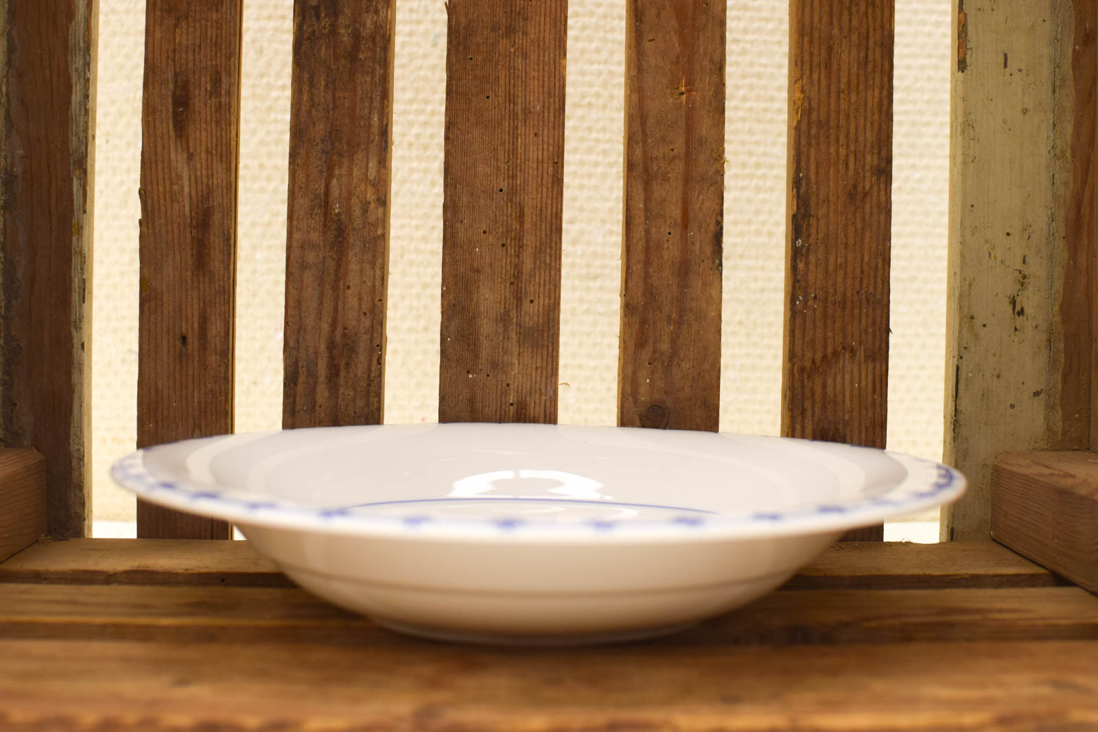 Deze set bevat 6 Expat porseleinen diepe borden, ieder 23 bij 23 centimeter in diameter en 4 centimeter diep. Ze hebben een klassiek wit porselein met een sierlijk blauw decorpatroon langs de rand. Het patroon bestaat uit kleine blauwe bloemmotieven die zich regelmatig rond de borden herhalen.