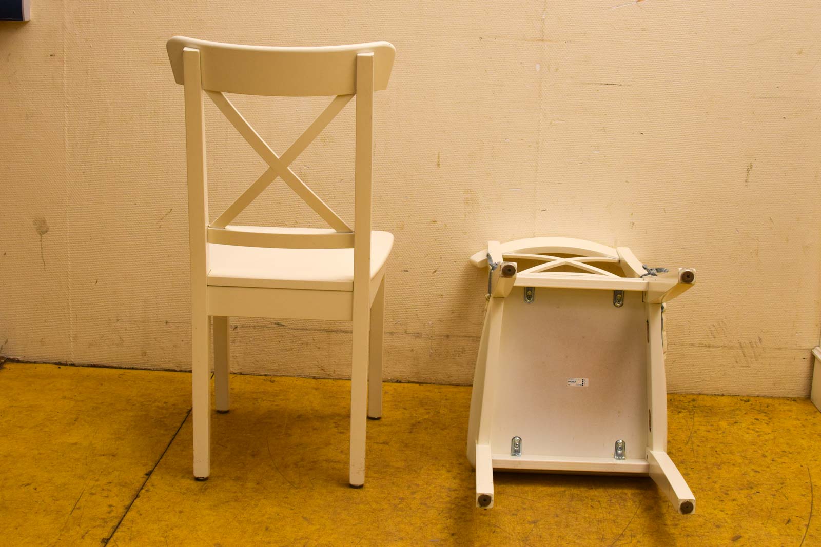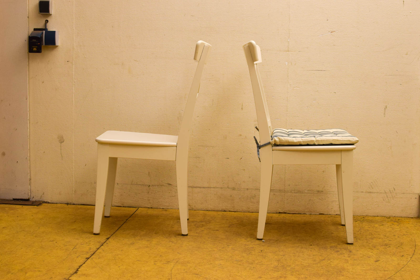 De stoelen tonen gebruikssporen van regelmatig gebruik, maar zijn nog stevig en functioneel. Op de zitting en rugleuning zijn kleine krassen en slijtplekken zichtbaar, wat gebruikelijk is voor tweedehands meubels die hun werk hebben gedaan. De constructie is solide en staat stabiel.