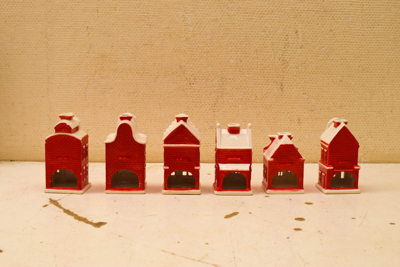 Deze set bevat 6 porseleinen kersthuisjes in klassiek rood met witte afwerkingen. Het zijn gedetailleerde miniatuurhuisjes met verschillende architectuurstijlen, van trapgevelhuizen tot stijlvolle kantoorgebouwen. Ze hebben nummers: 1, 2, 4, 5, 6 en 8. Het grootste huisje is 12,5 cm hoog, 7 cm breed en 6 cm diep. De andere huisjes varieren in grootte.