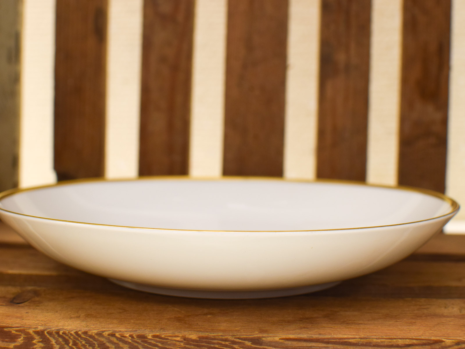 Dit zijn 6 diepe borden van Thomas porselein met een goudkleurige rand. De borden hebben een diameter van 22 cm en een diepte van 3,5 cm, wat ze geschikt maakt voor soepen, stoofschotels en andere gerechten waar je wat meer ruimte nodig hebt dan bij een vlakke bord.