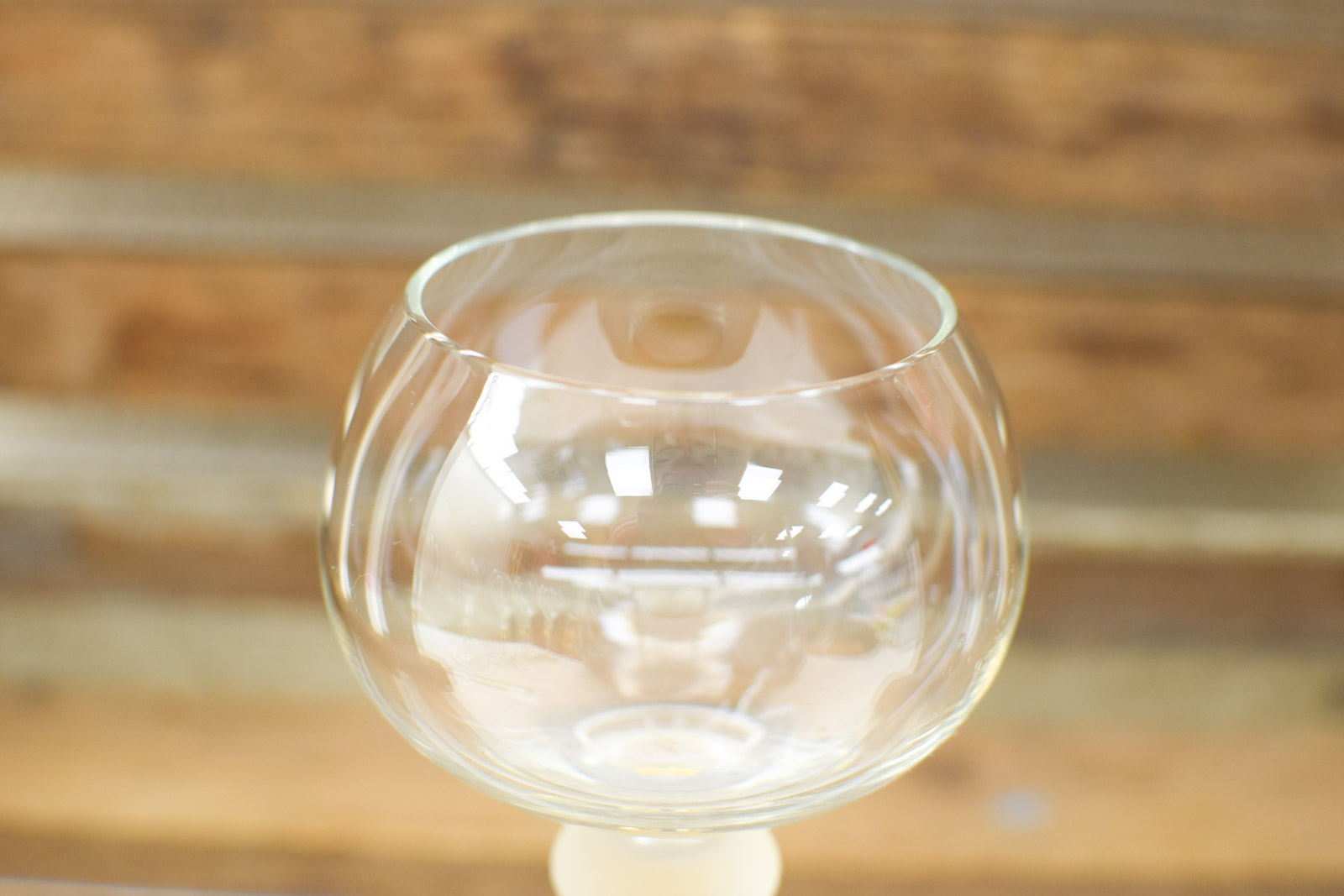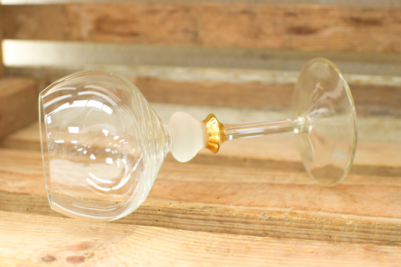 Dit is een set van 6 wijnglazen op voet met goudkleurige versiering aan de basis. De glazen zijn helemaal heel en in goede staat. Met een diameter van 6 cm aan de opening en een hoogte van 16,5 cm hebben ze een klassiek silhouet dat past bij zowel moderne als traditionele tafels.