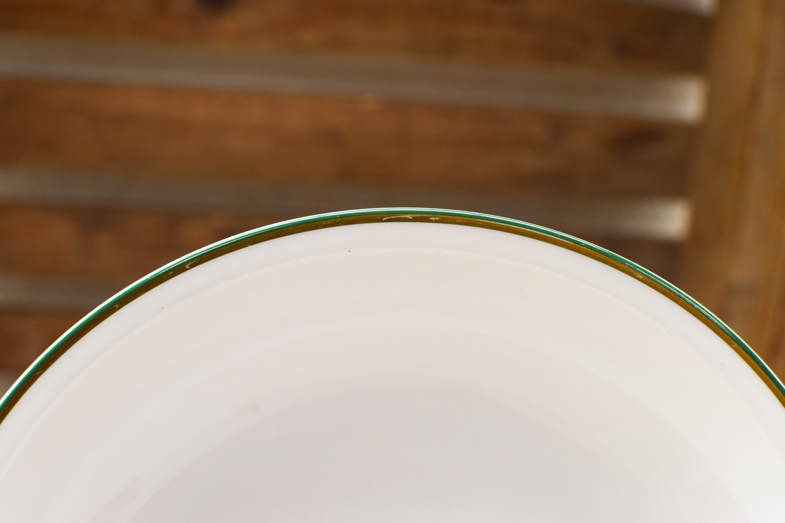 Set van 7 Arzberg porseleinen diepe borden met groen-gouden rand. Diameter 20,5 cm, hoogte 4 cm. Lichte krasjes maar verder in goede staat.