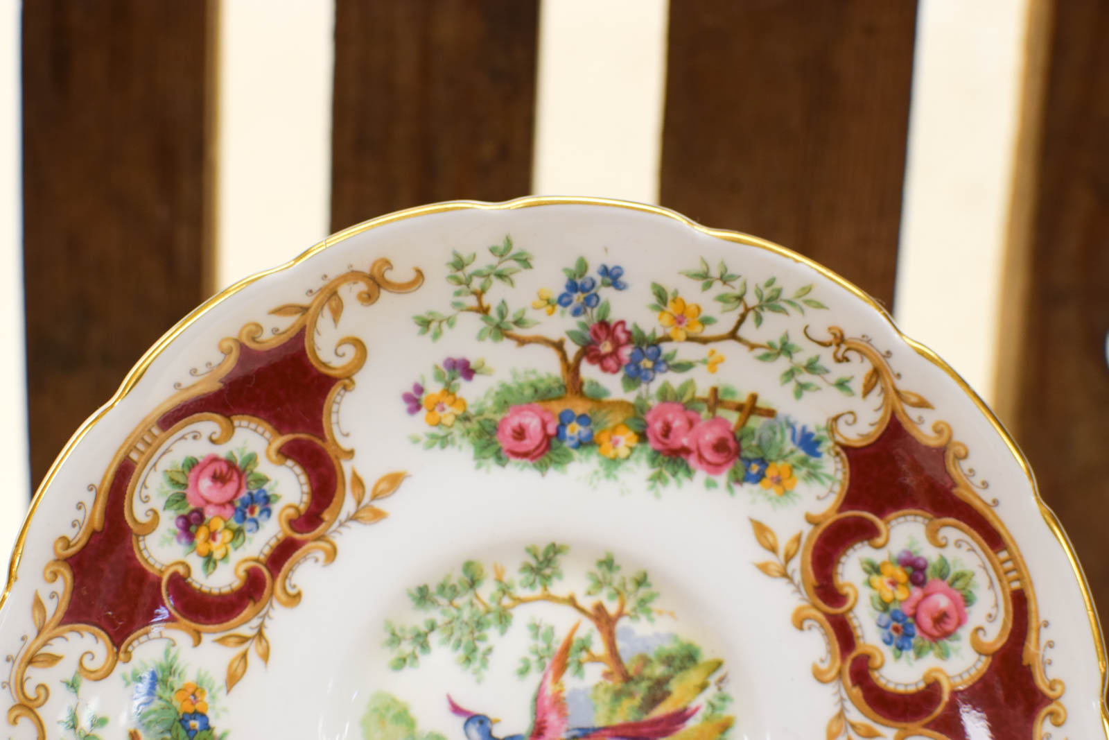 Deze set van 7 stuks Coalport porseleinen schoteltjes (artikelnummer 45646), gemaakt van fijn Bone China porselein in Engeland, straalt elegantie en klassieke charme uit dankzij het rijke bloemendecor en de goudaccenten, met een gedetailleerd tafereel van een exotische vogel in een sierlijk landschap als blikvanger, ideaal voor verzamelaars of liefhebbers van Engels servies met een romantische uitstraling, waarbij elk schoteltje het merkteken ‘Coalport Made in England Est. 1750’ draagt, wat staat voor kwaliteit en een lange traditie van vakmanschap in porselein.