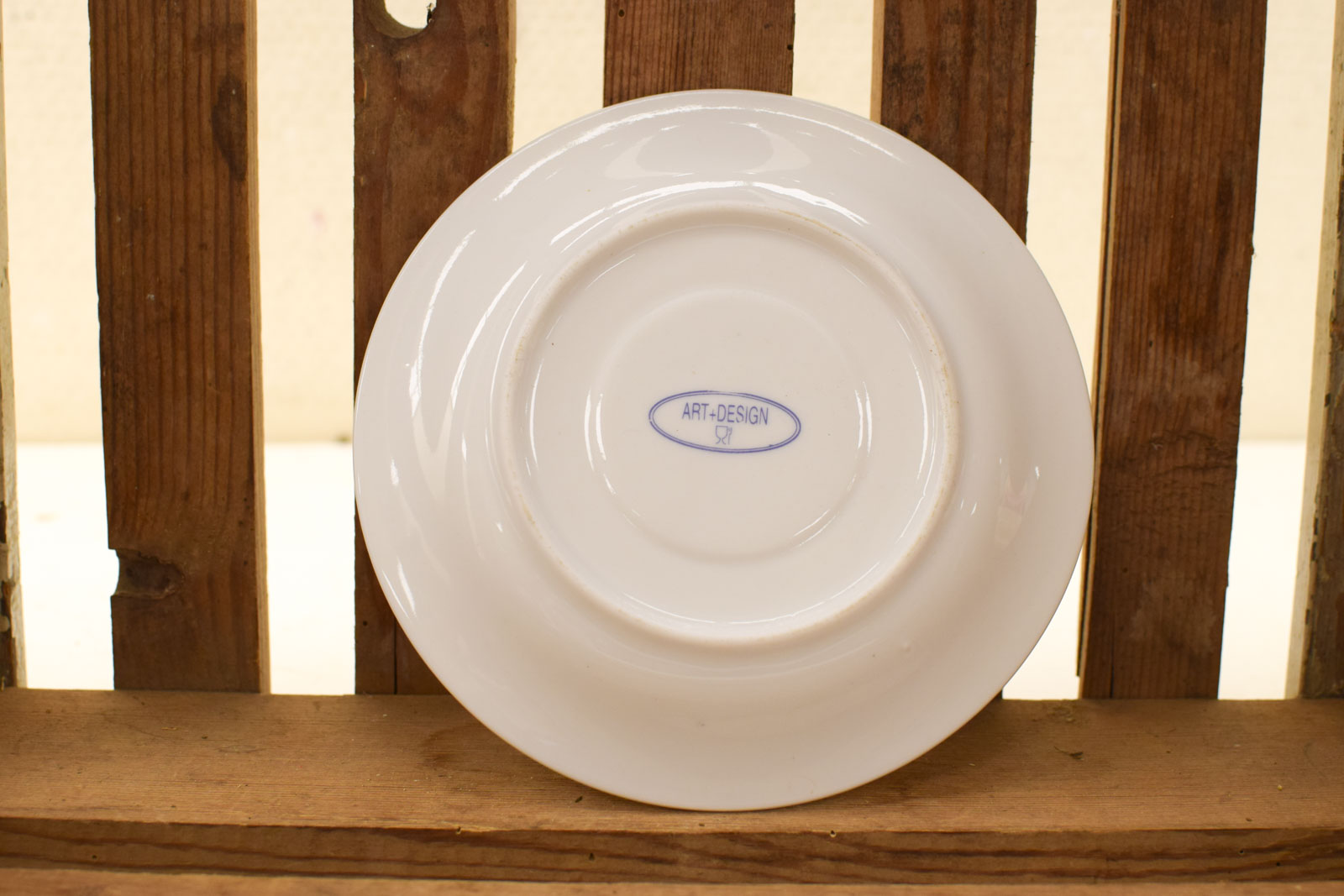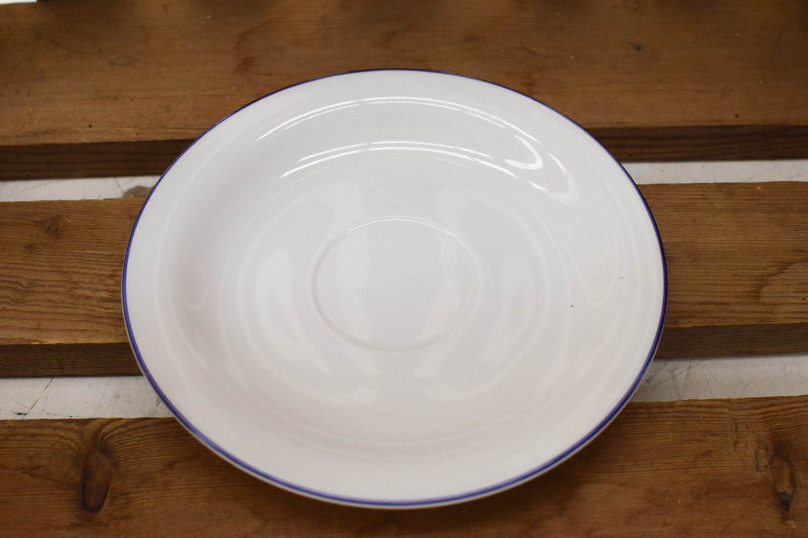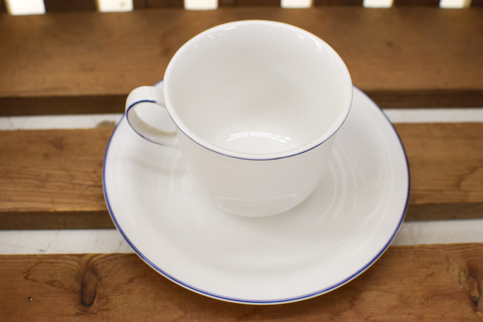 Diameter bovenkant opening van het kopje hoog 8,5 cm hoog 7 cm diameter van het schaaltje 15,5 cm heeft een blauwe randje het servies heeft lichte krasjes is verder nog heel en redelijk