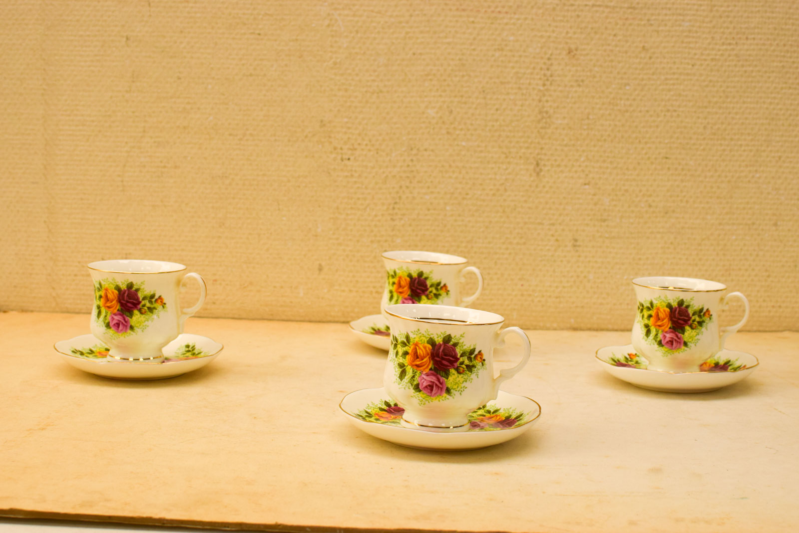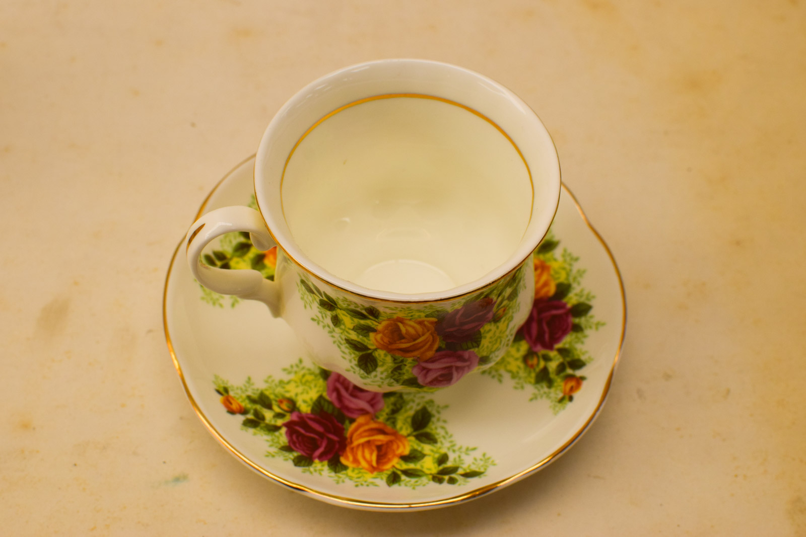het kopje gemeten diameter bovenkant opening 7,5 cm hoog 7 cm diameter van het schaaltje 13 cm hoog 2 cm het servies heeft slijtage op het goudkleurige geverfde randje