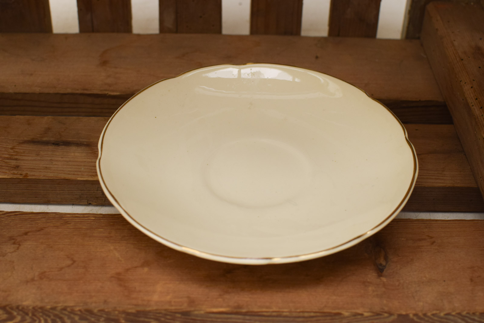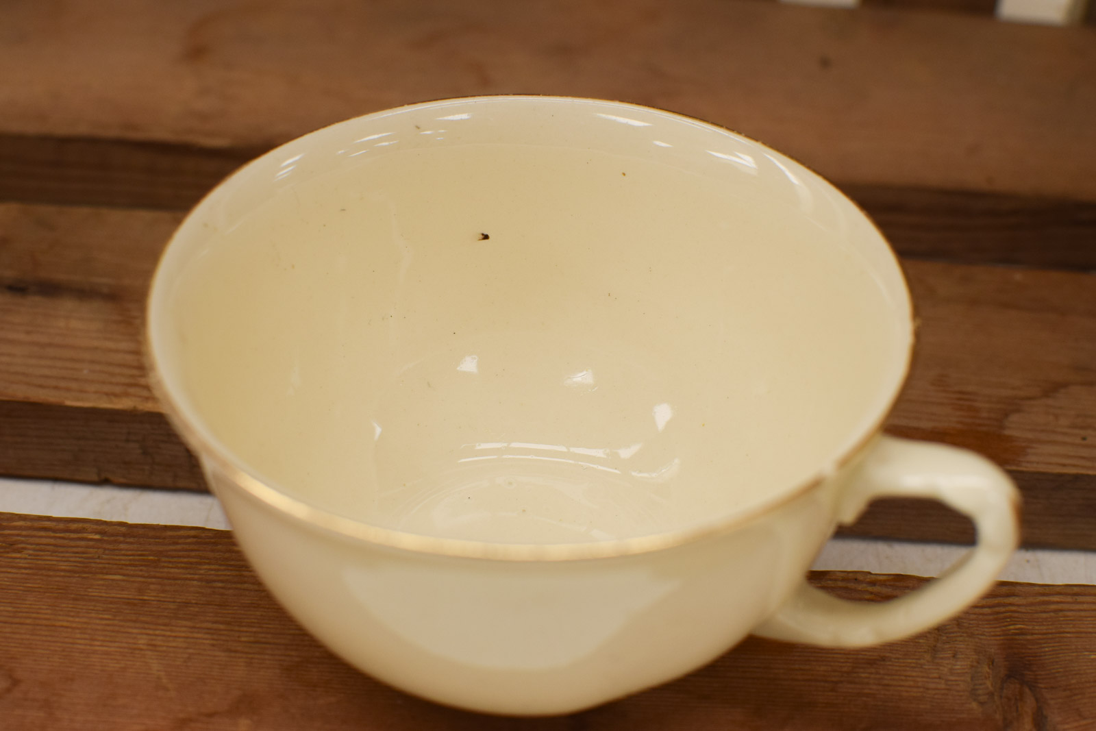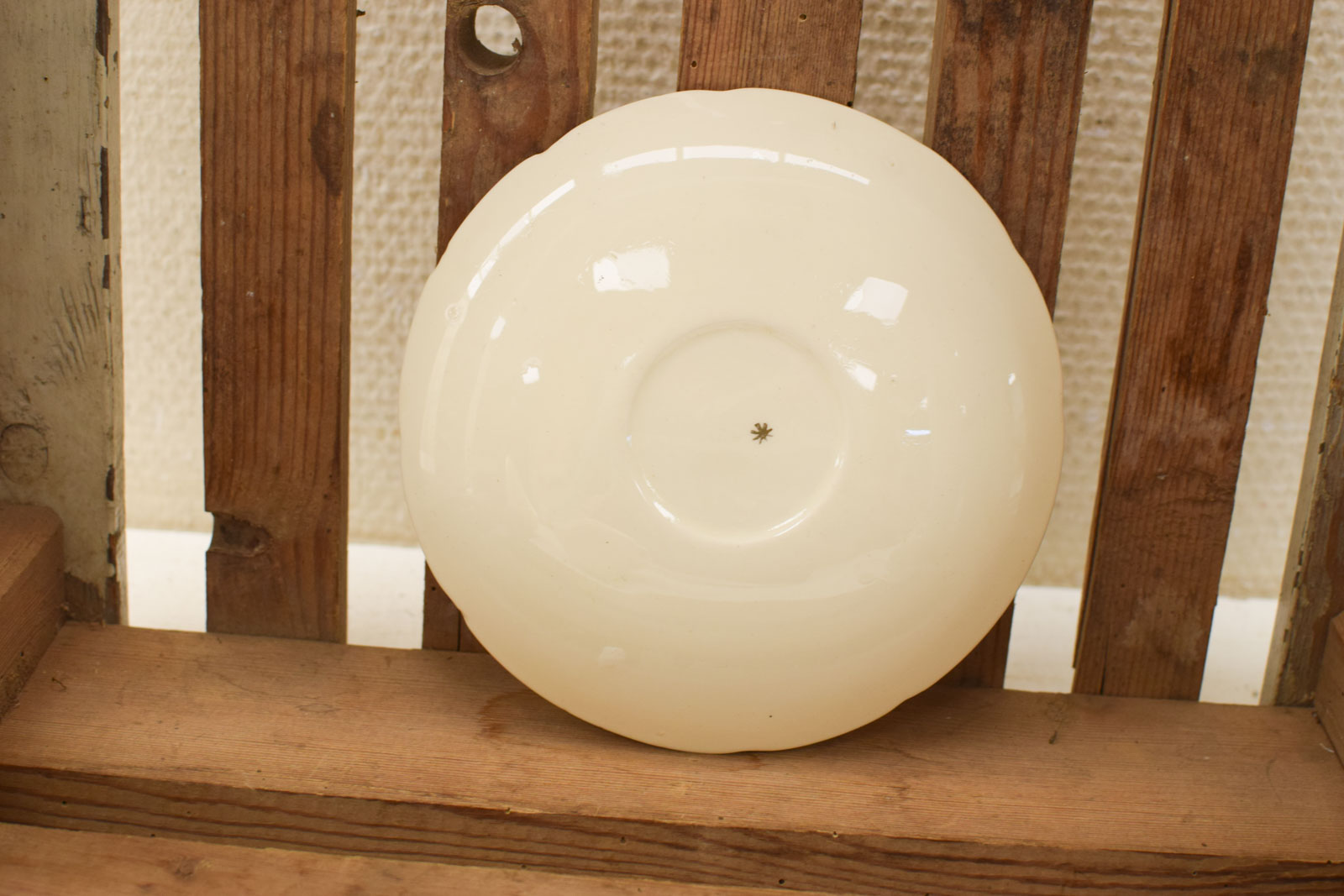 het kopje gemeten diameter bovenkant opening 9,5 cm hoog 5,5 diameter van het schaaltje 15,5 cm 1 kopje heeft een zwart vlekje aan de binnenkant het servies heeft vlekjes krasjes en slijtage aan het geverfde randje