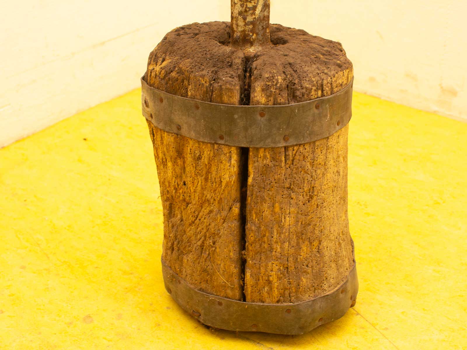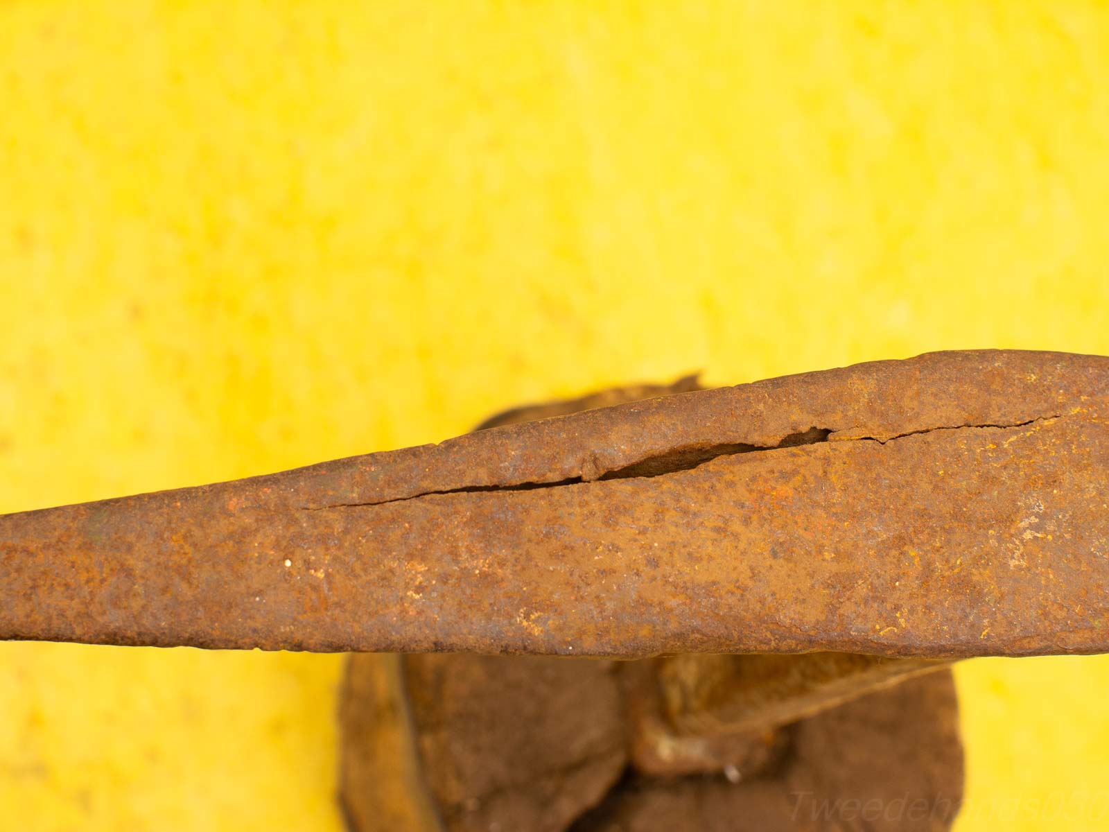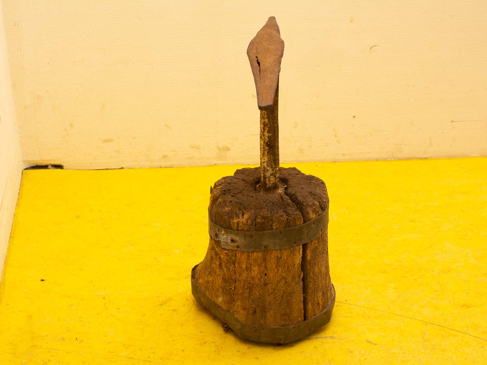 zit een barst in het hout en in de aambeeld een scheur het hout heeft wat last van houtworm en barsten in het hout de aambeeld heeft roest en een barst bovenop