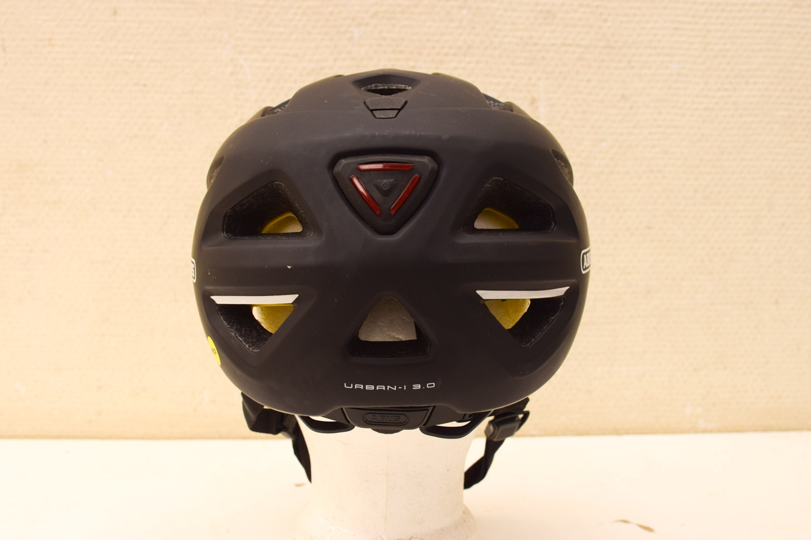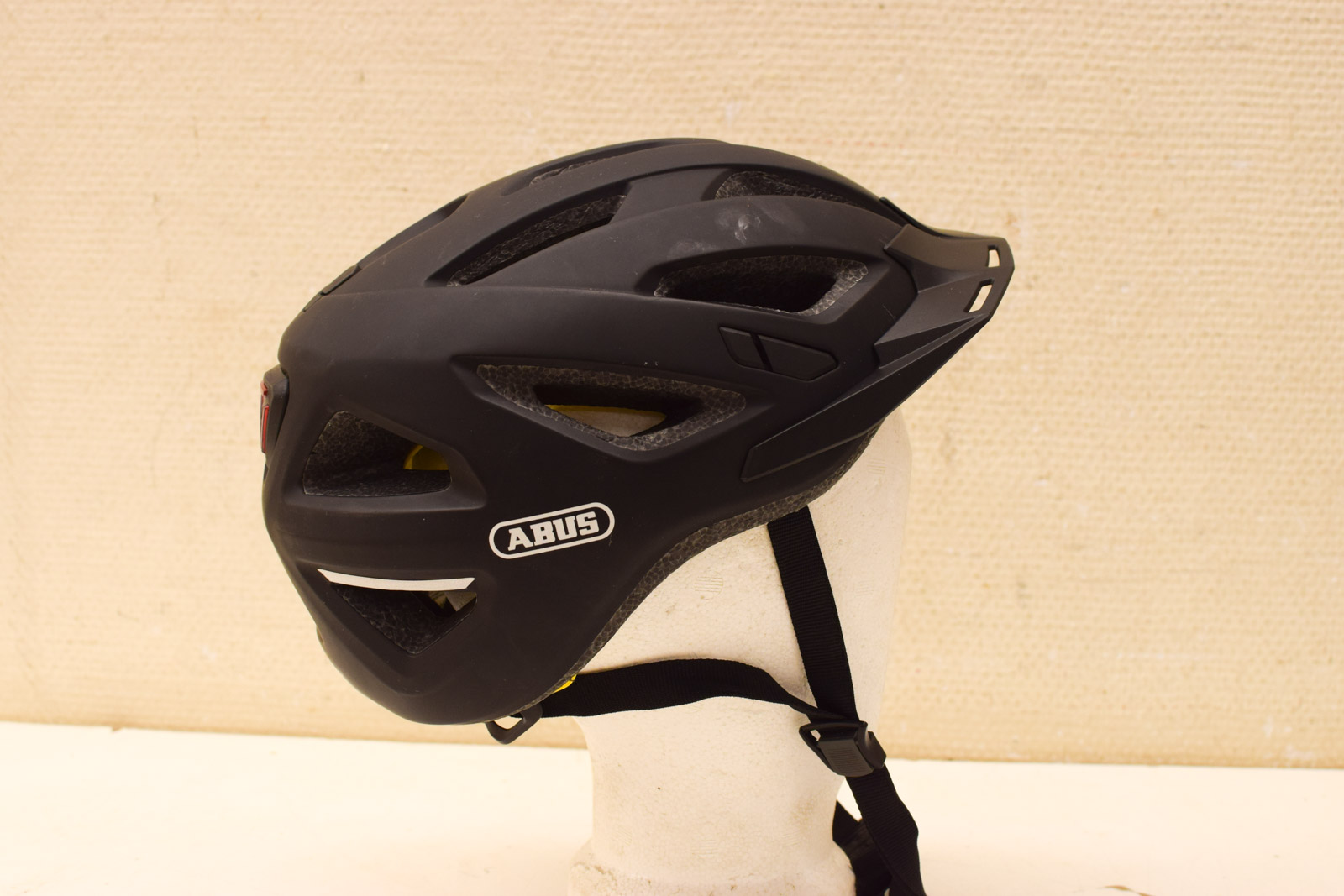 De helm is tweeledig uitgevoerd met een hard buitenschaal en voering aan de binnenkant. Abus is een gerenommeerd Duits merk dat al decennia fietshelmen en slots produceert en staat bekend om betrouwbaarheid en veiligheid. Deze helm heeft zichtbare gebruikssporen – de kunststof buitenkant toont krassen en minimale slijtage, met name zichtbaar op de zijkanten en rond de ventilatieopeningen.