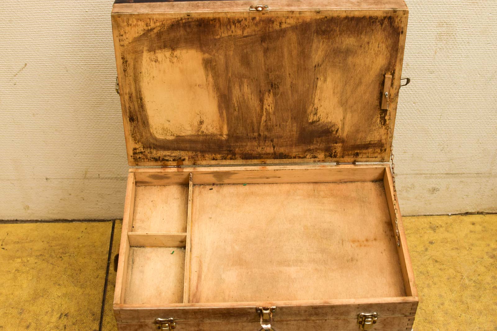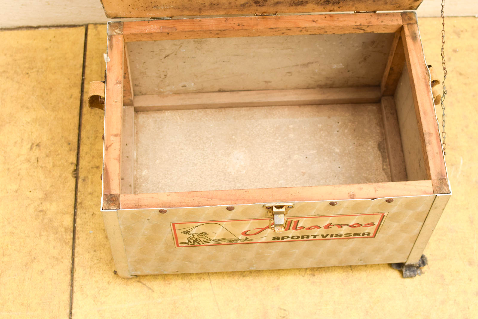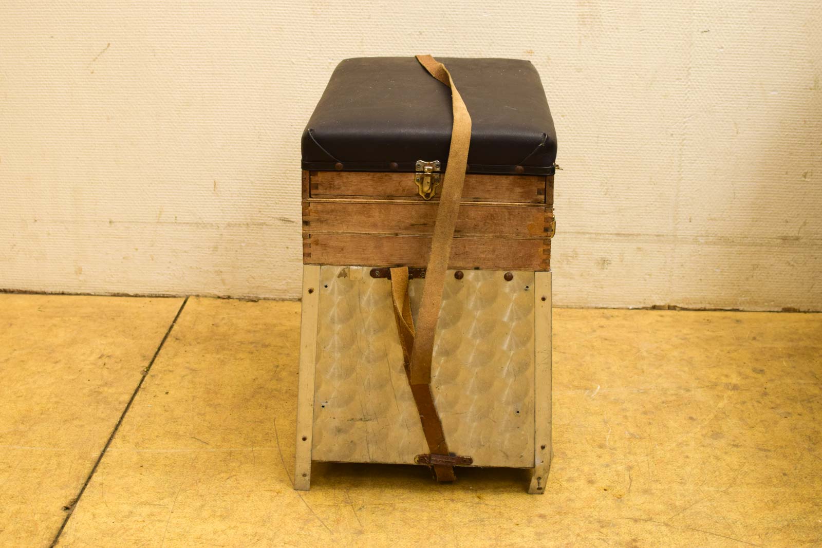 de viskoffer heeft houten laatjes en de onderstel is van Aluminium de bovenkant is een zachte zitvlak de viskoffer is gebruikt
