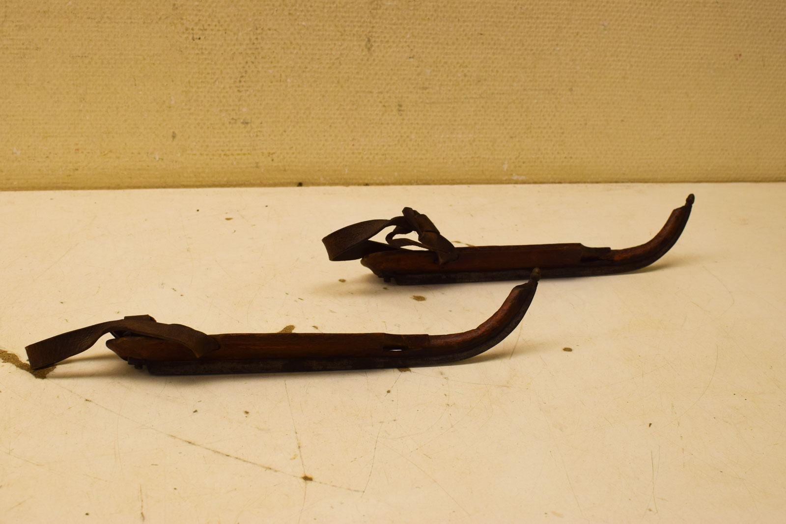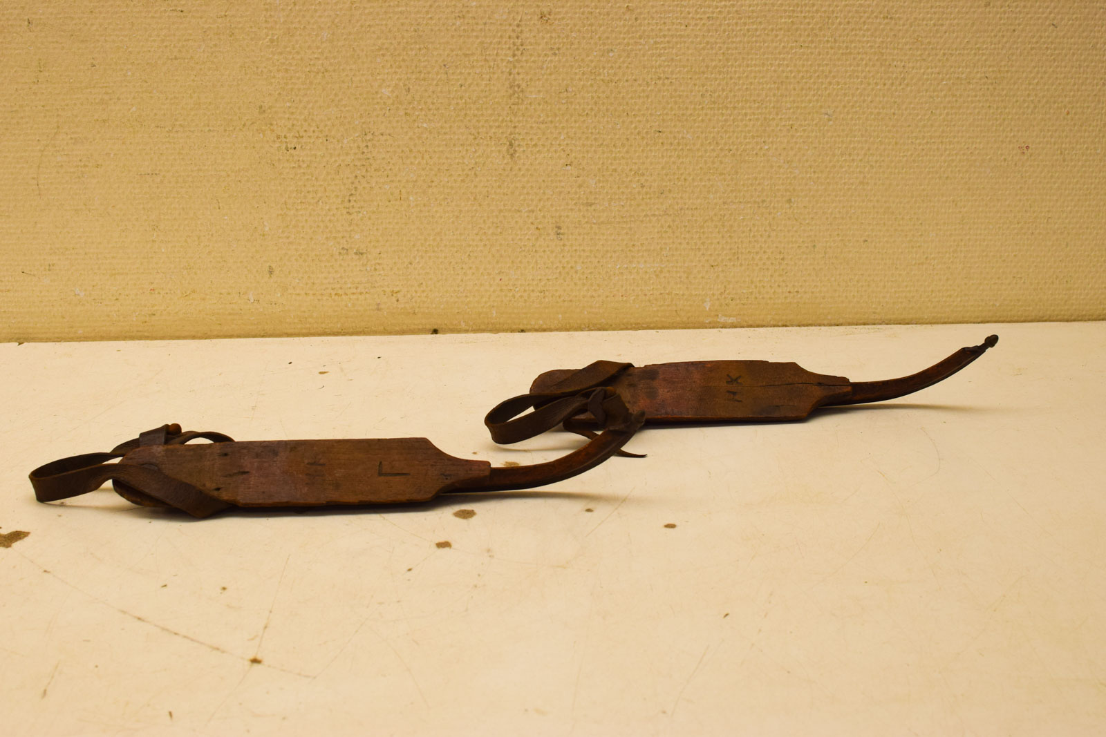 het hout heeft gebruikssporen en heeft rest er zijn alleen de achterste riempjes bij er is geen merkje hoog 5,5 cm