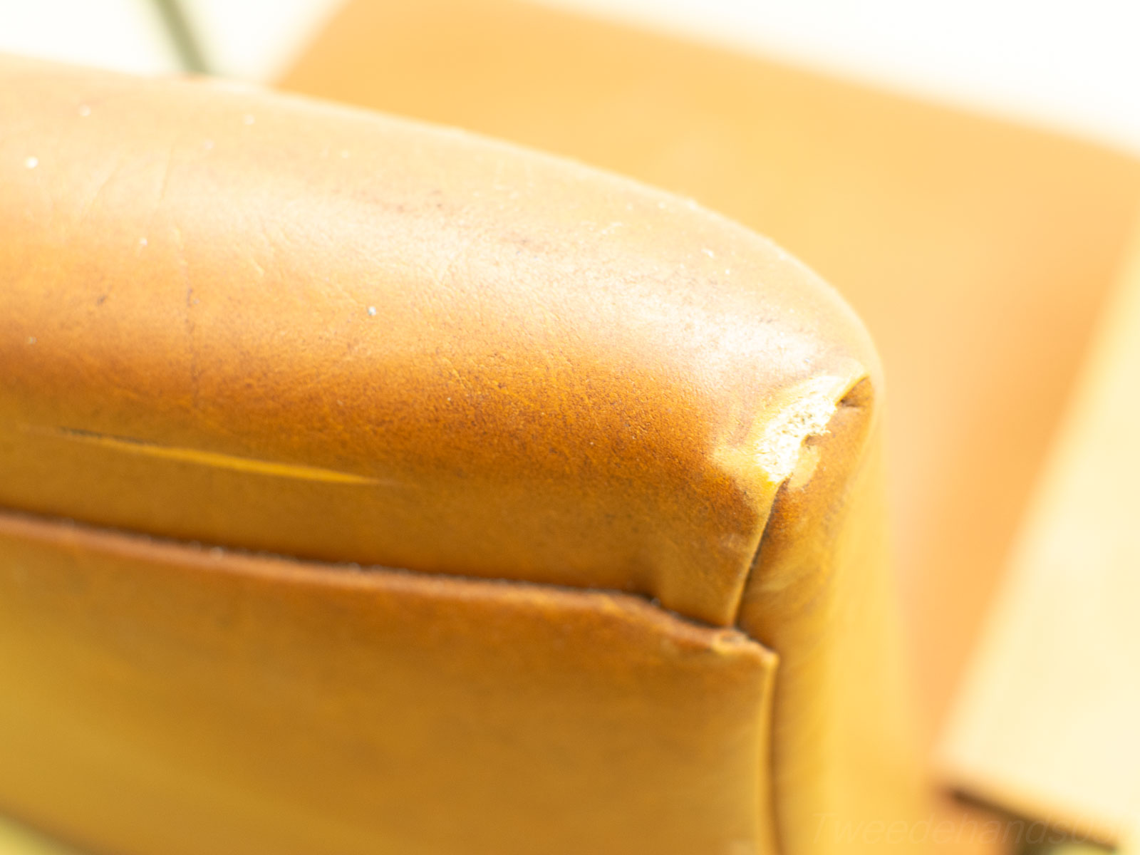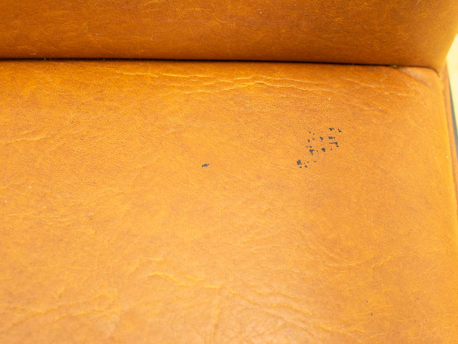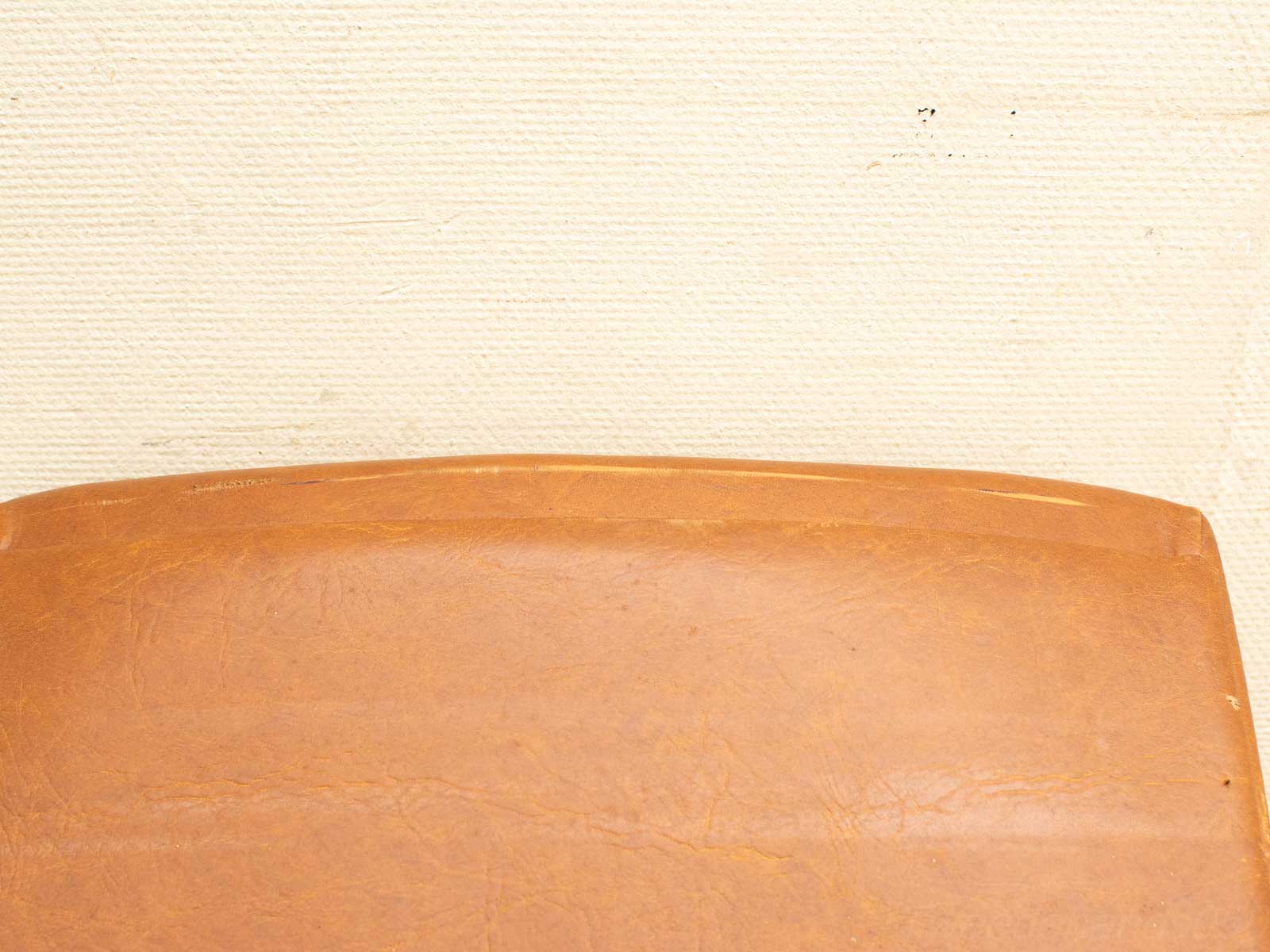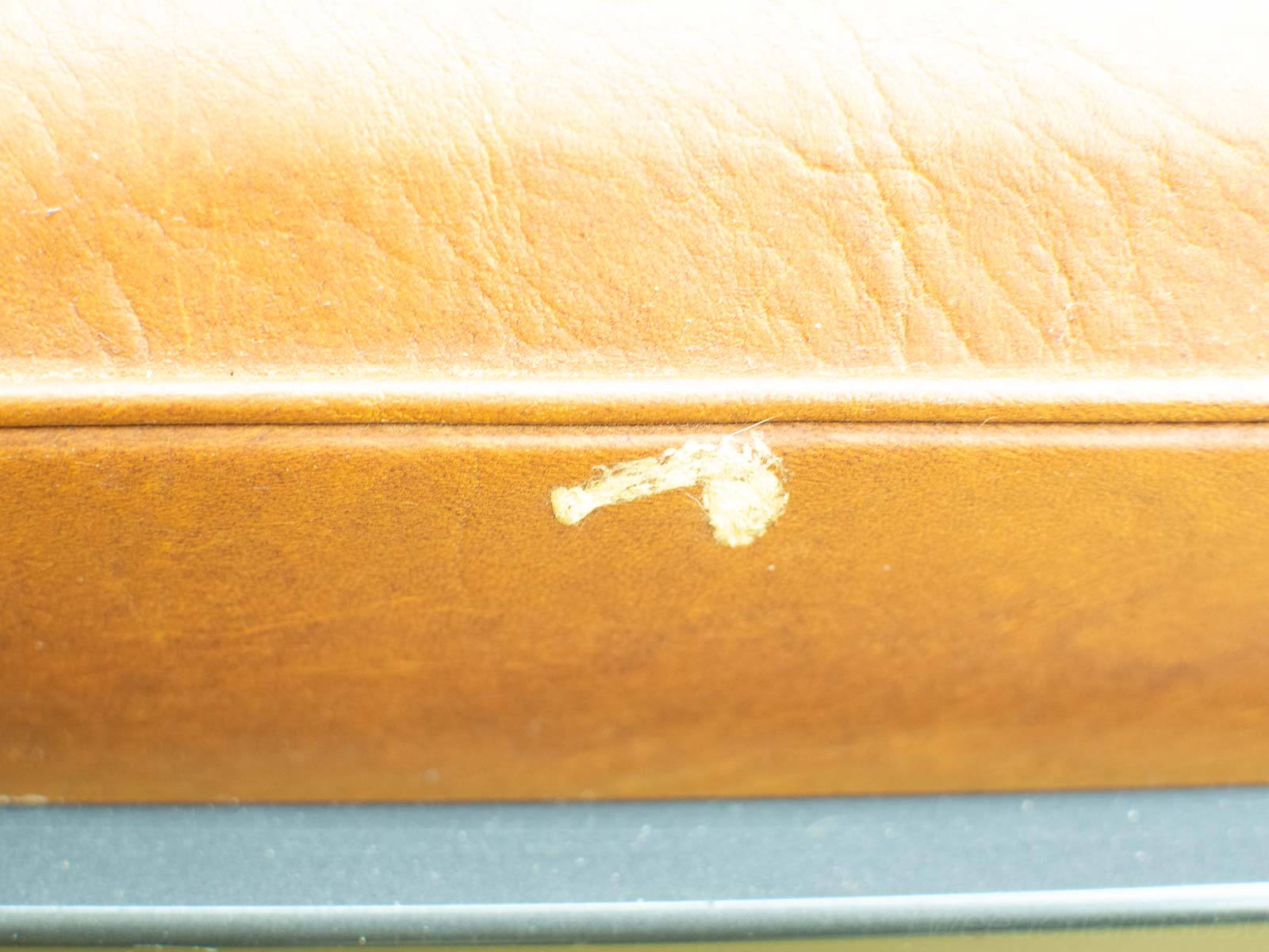 de stoel heeft aan de zitvlak deukjes en aan de bovenkant laat de leer een stukje los de stoel heeft een paar gebruikersporen