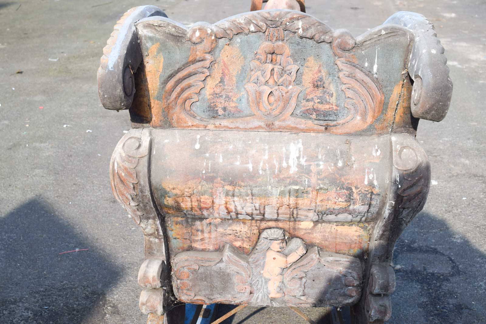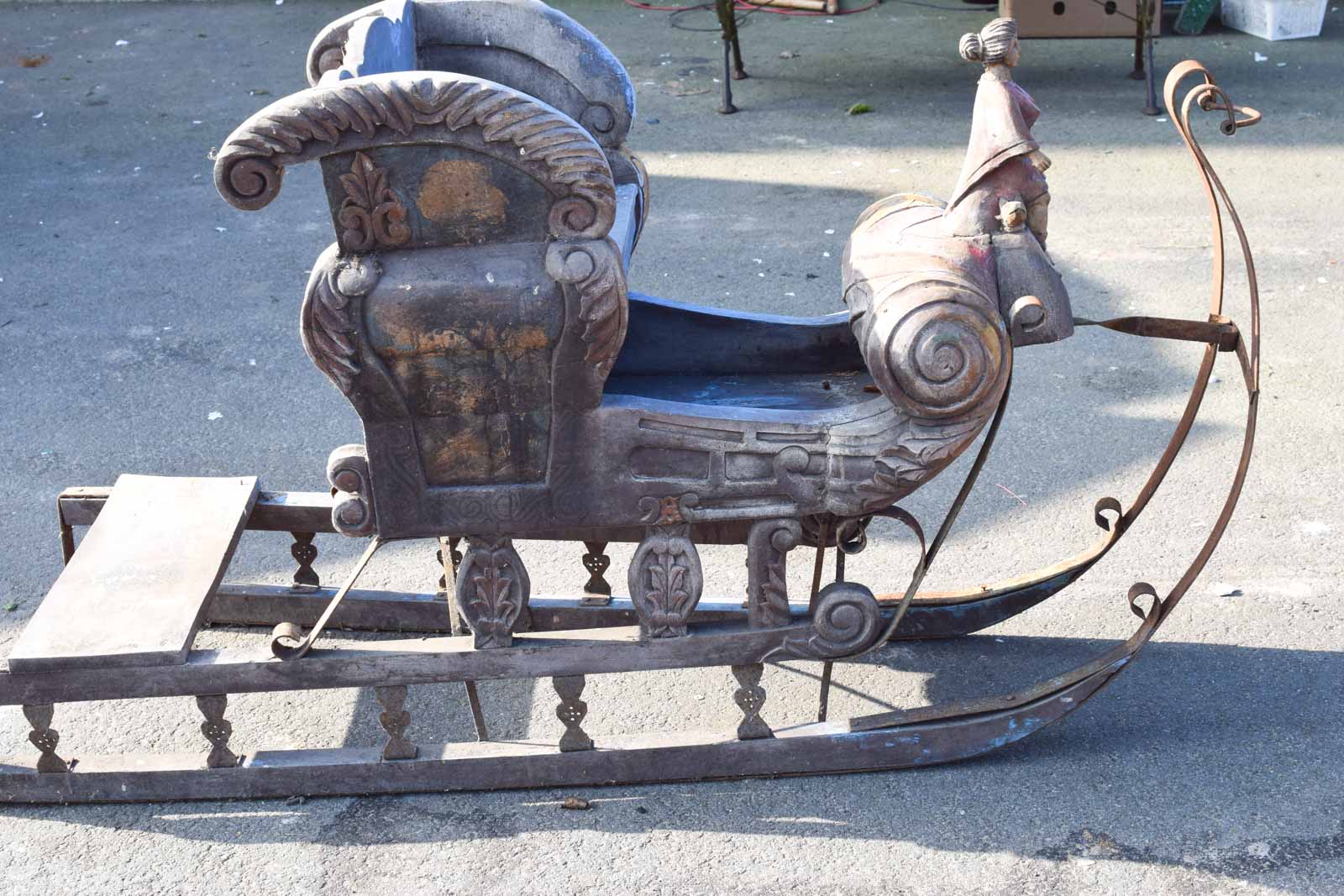 de arrenslee is een opknapper het hout van de slee heeft gebruikssporen scheuren en heeft barsten het verf is verkleurd de slee heeft roest