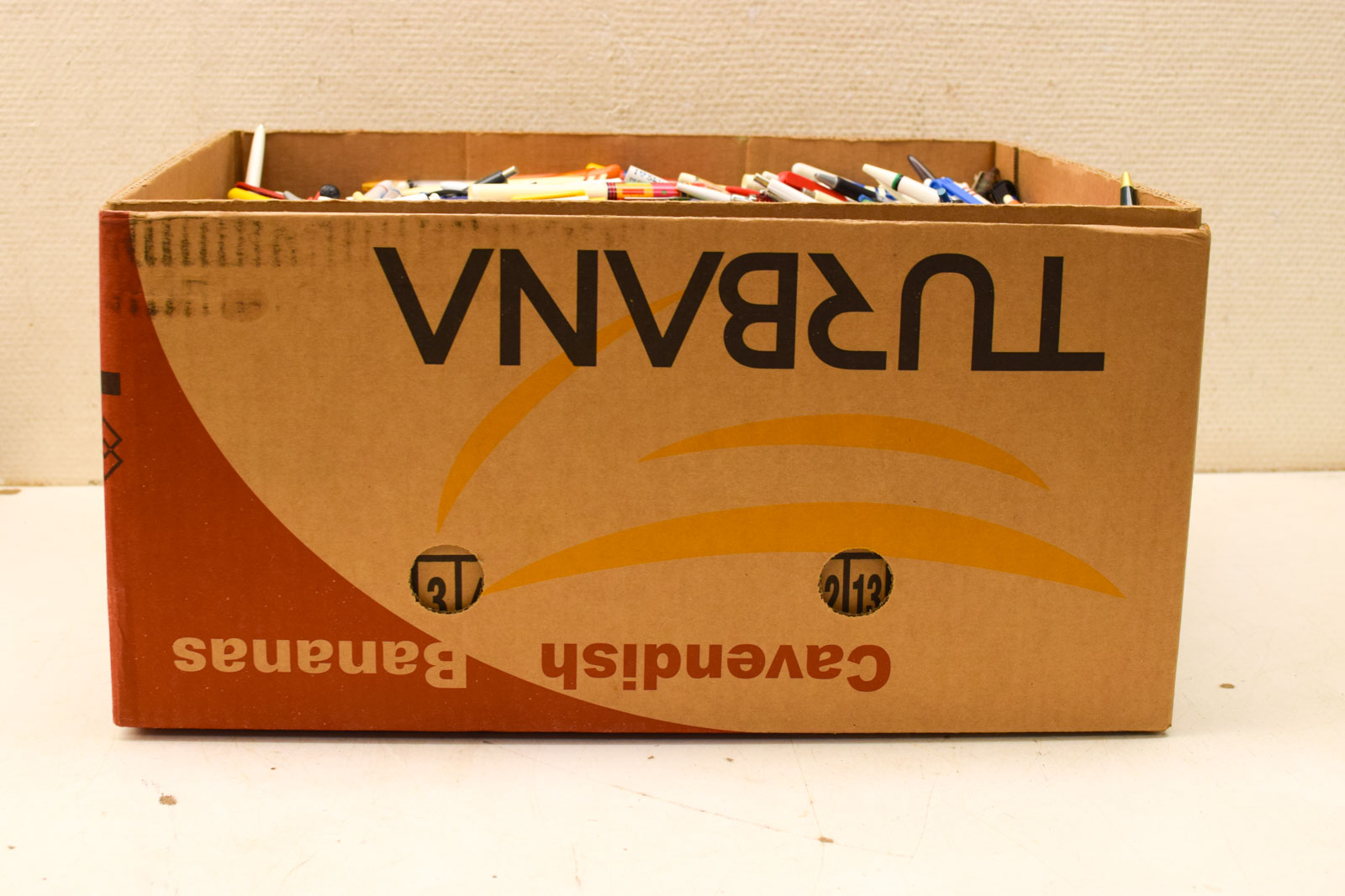de doos is breed 49 cm diepte 39 cm hoog 25 cm we hebben de pennen niet geteld