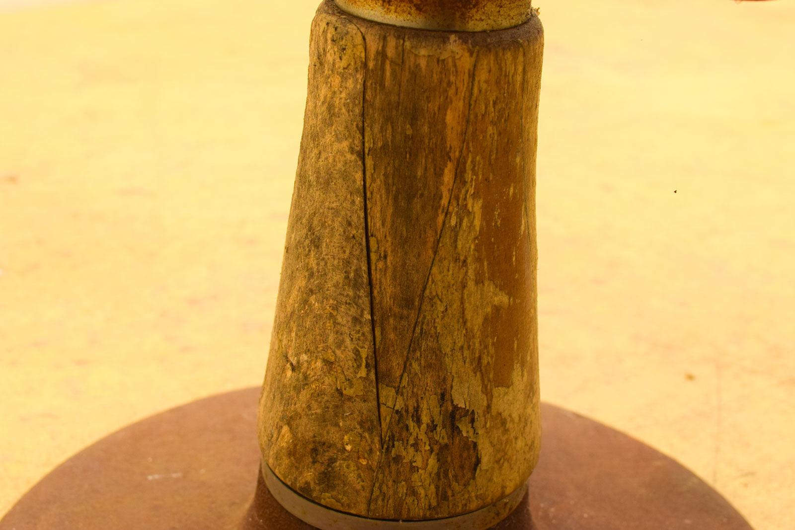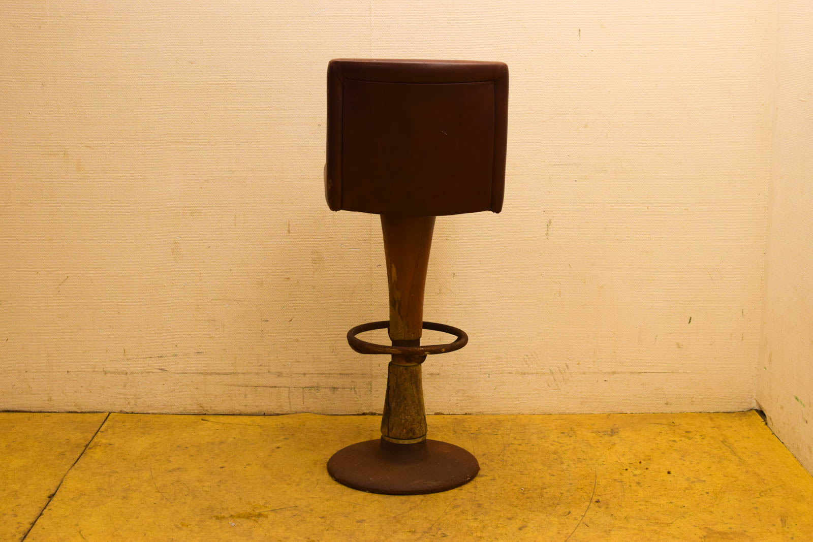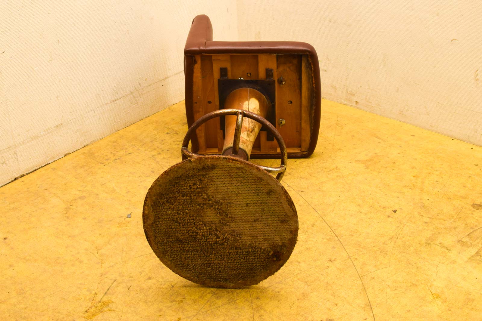 Gebruikssporen en roest zijn duidelijk zichtbaar op het hout en de metalen delen. De lering vertoont normale slijtage met enkele krassen. Dit soort gebruikssporen geven juist het authentieke karakter aan tweedehandsmeubelen. De voet is voorzien van een metalen voetsteun en een ronde basis voor stabiliteit.