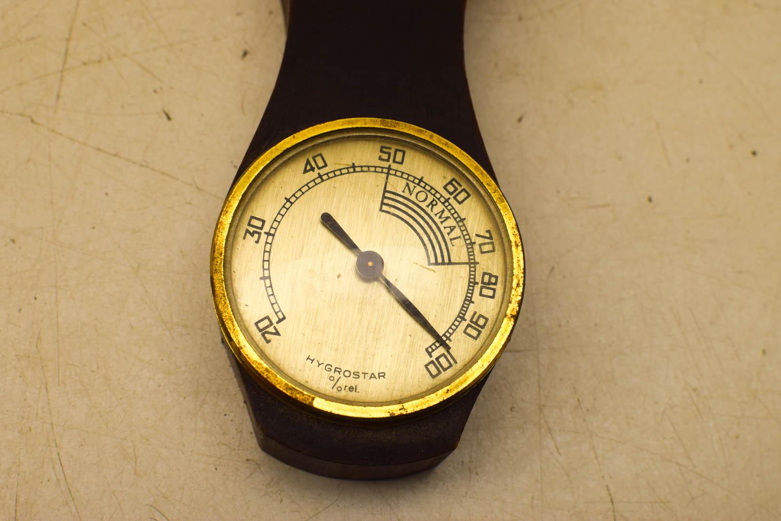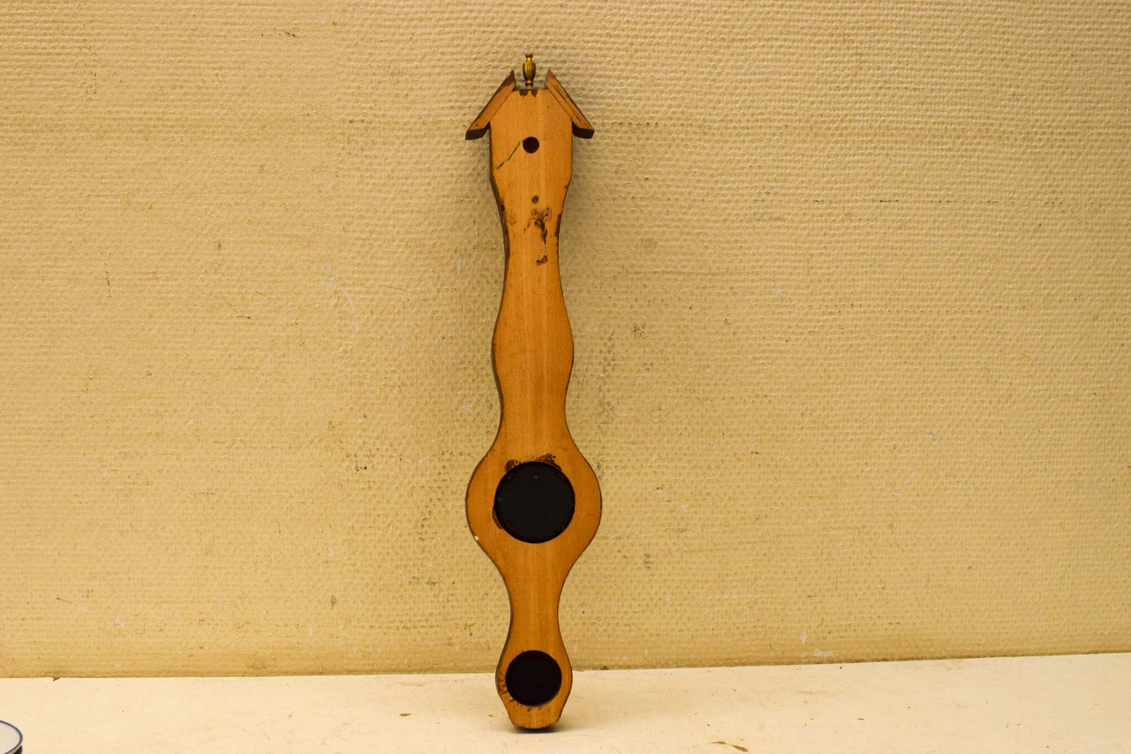 Werkt naar behoren; normale gebruikssporen aan messing randen en hout; ophangoog aanwezig
