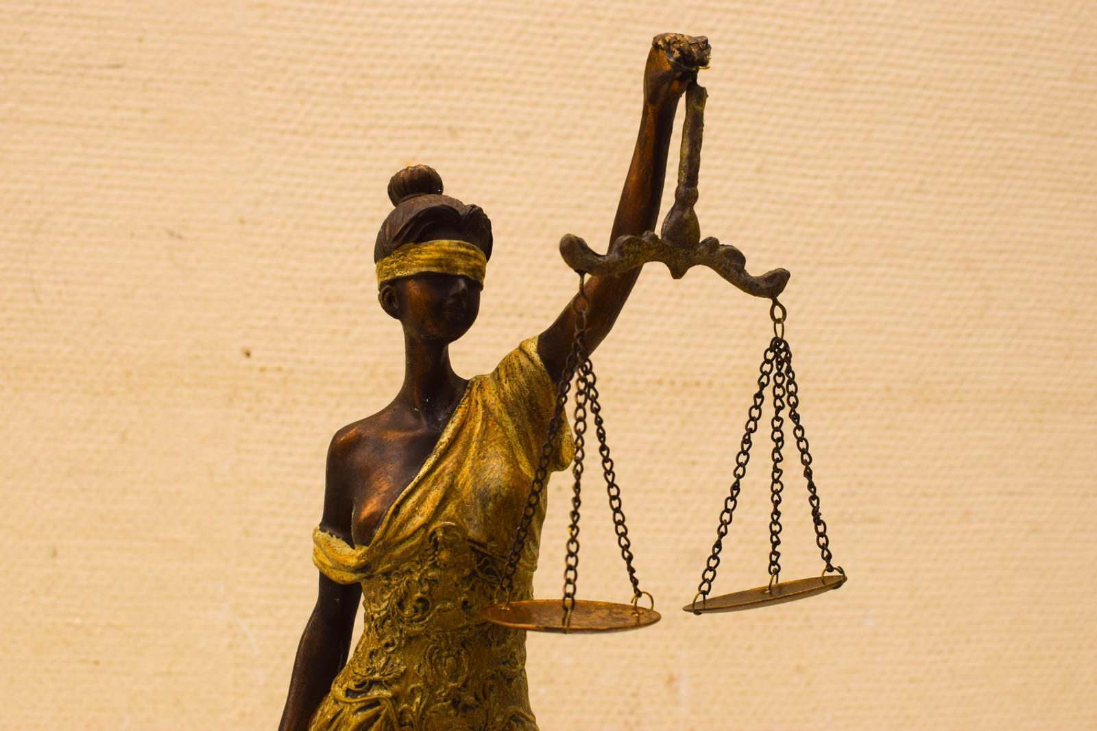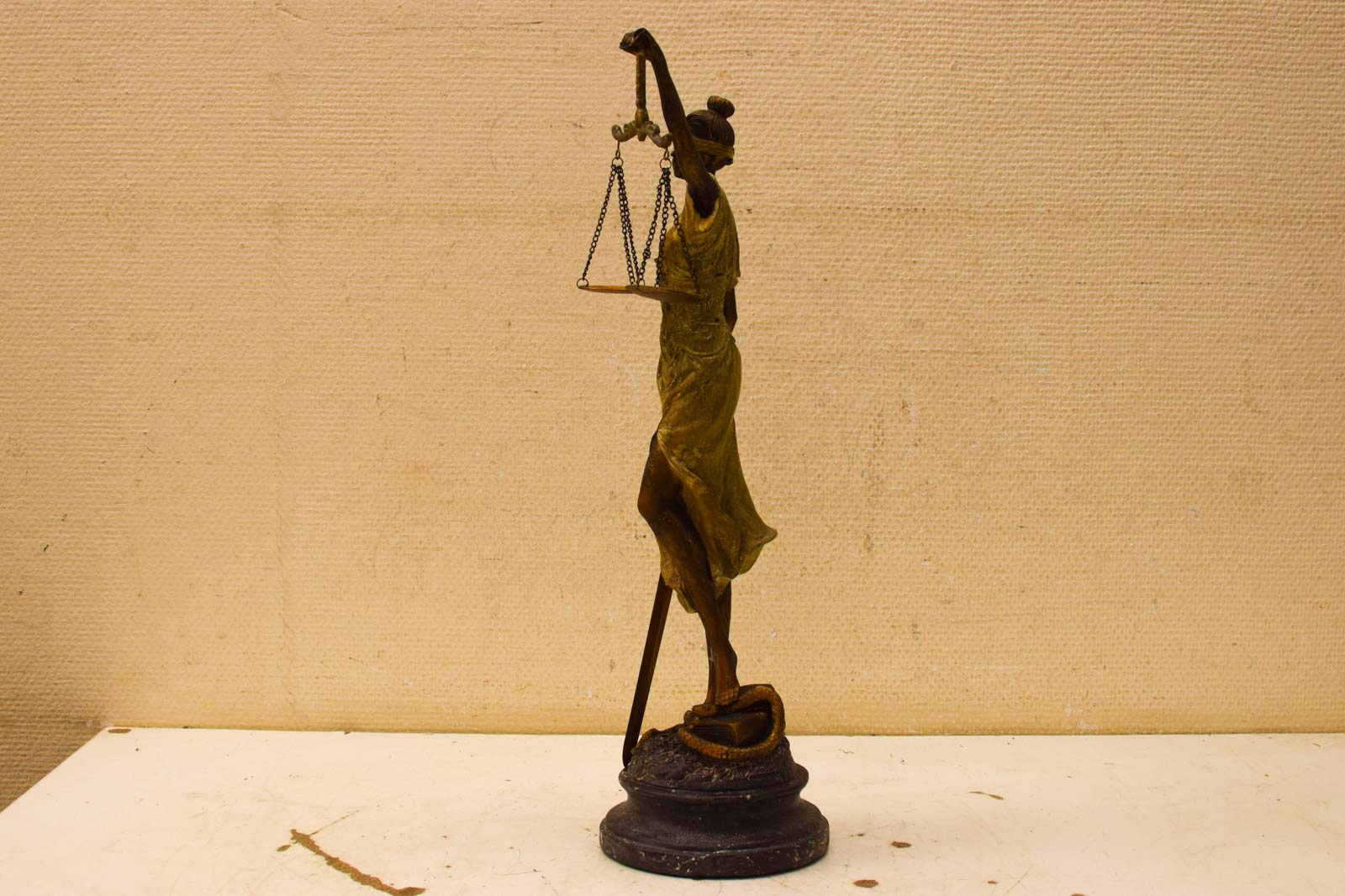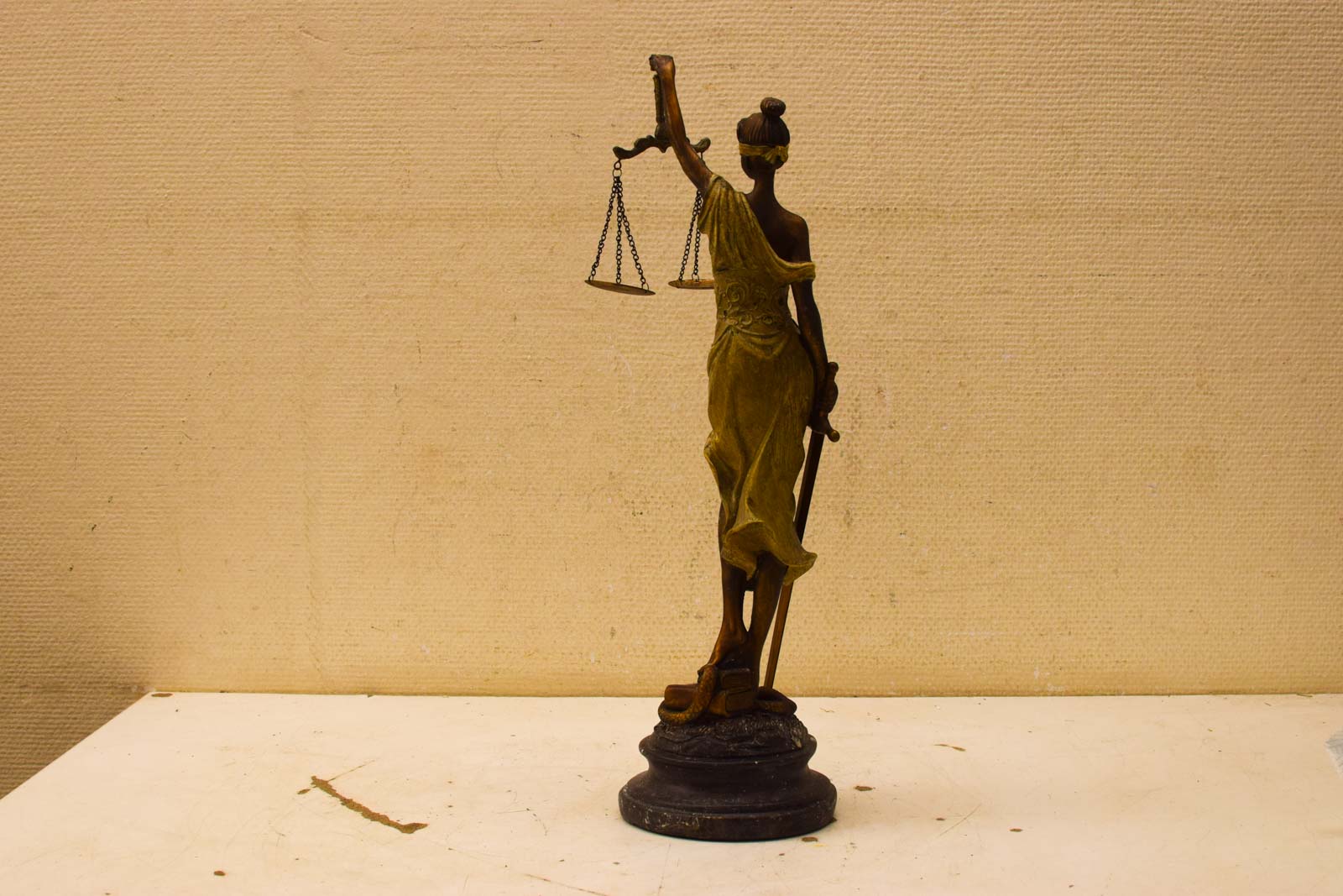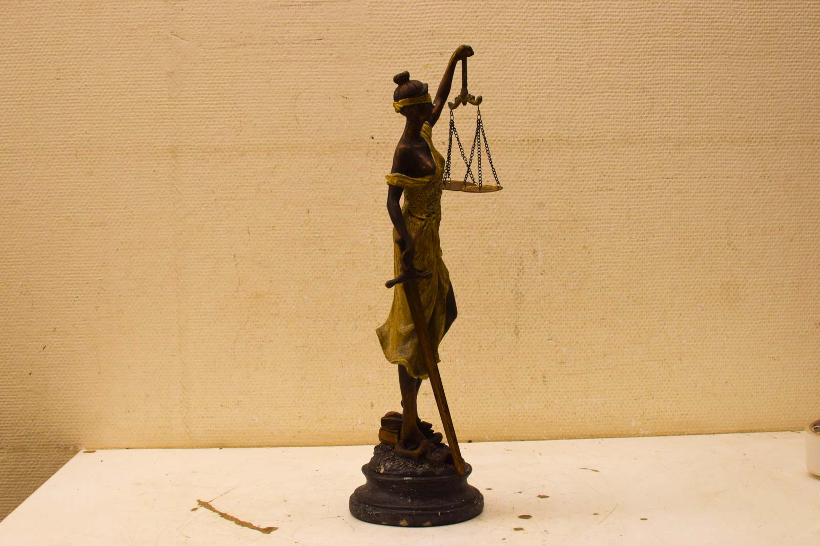 Het materiaal is kunststof, wat het relatief licht maakt en niet gevoelig voor vocht. De afwerking combineert een donkerbruin lijf met goudkleurige accenten in het gewaad en de blinddoek, wat contrast en elegantie geeft. Het beeld staat op een ronde basis met een licht gefinieerde oppervlakte.