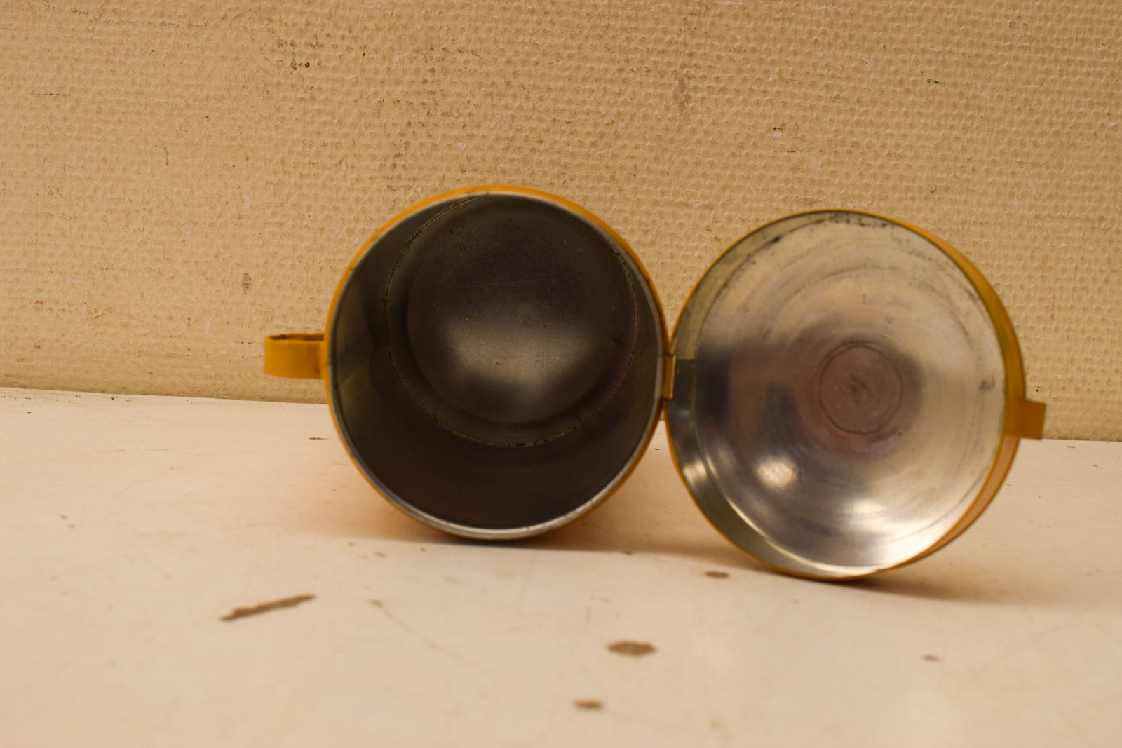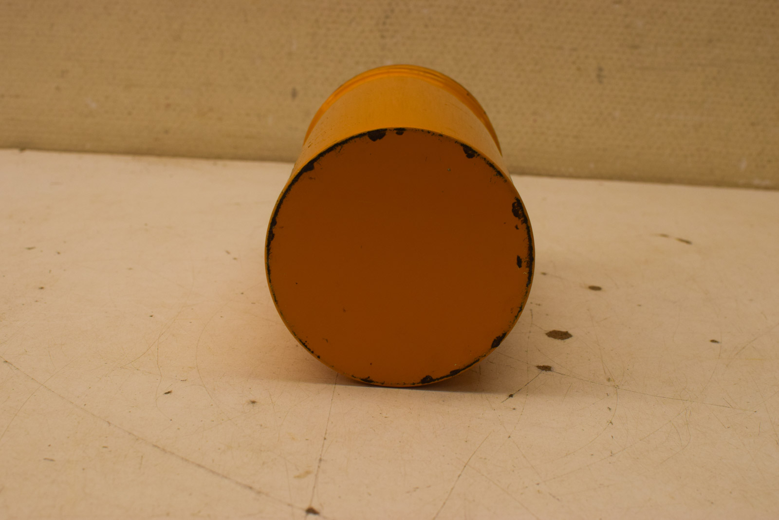 de blik heeft roestplekjes en gebruikssporen de deksel sluit nog goed af diameter bovenkant 10,5 cm gemeten zonder deksel hoog 20 cm