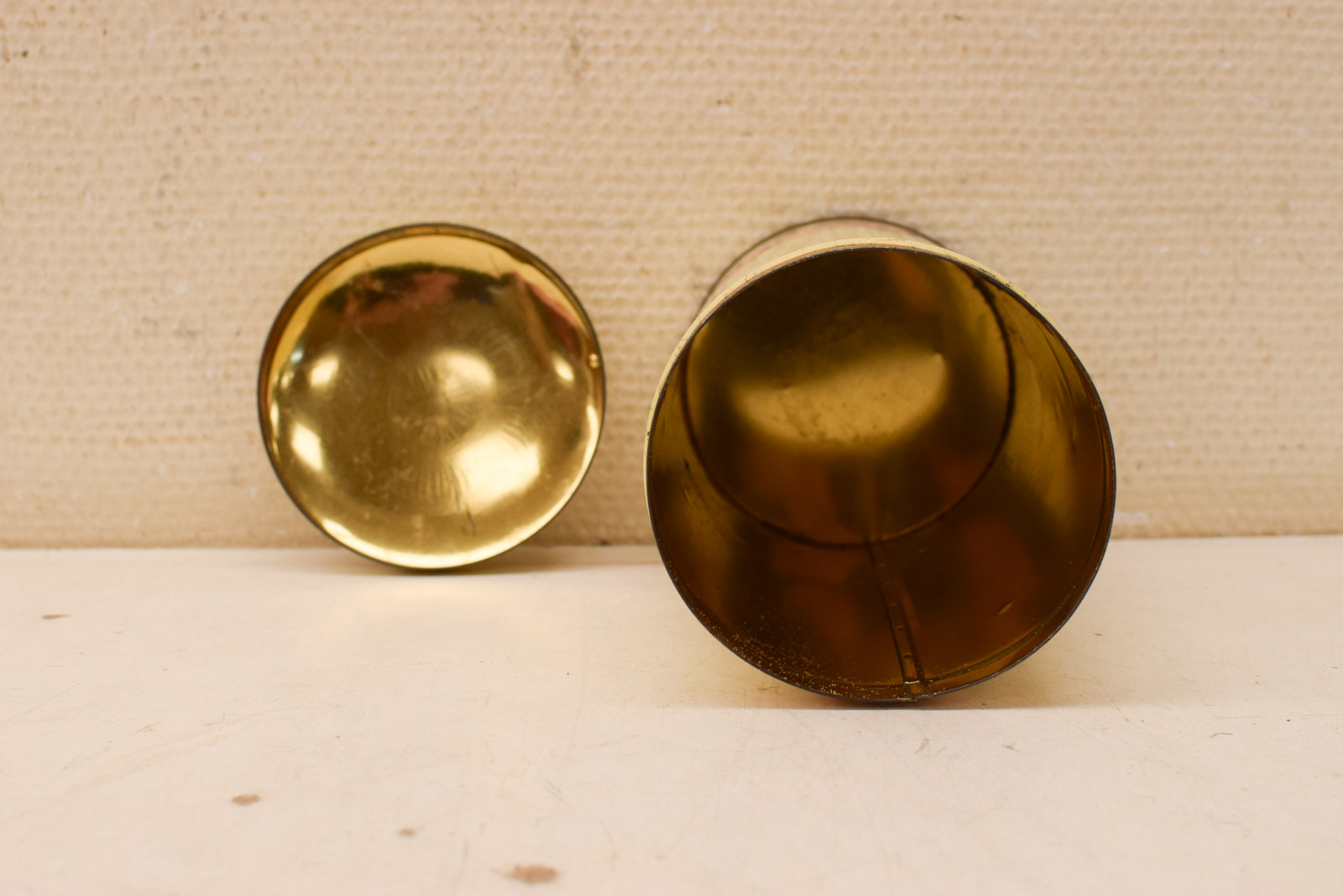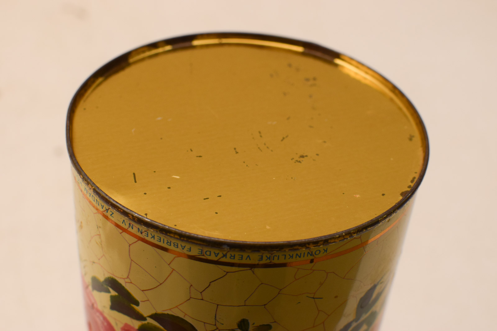 de blik heeft roest en vlekken de deksel sluit nog goed af diameter bovenkant opening 10.5 cm gemeten zonder deksel hoog 21 cm
