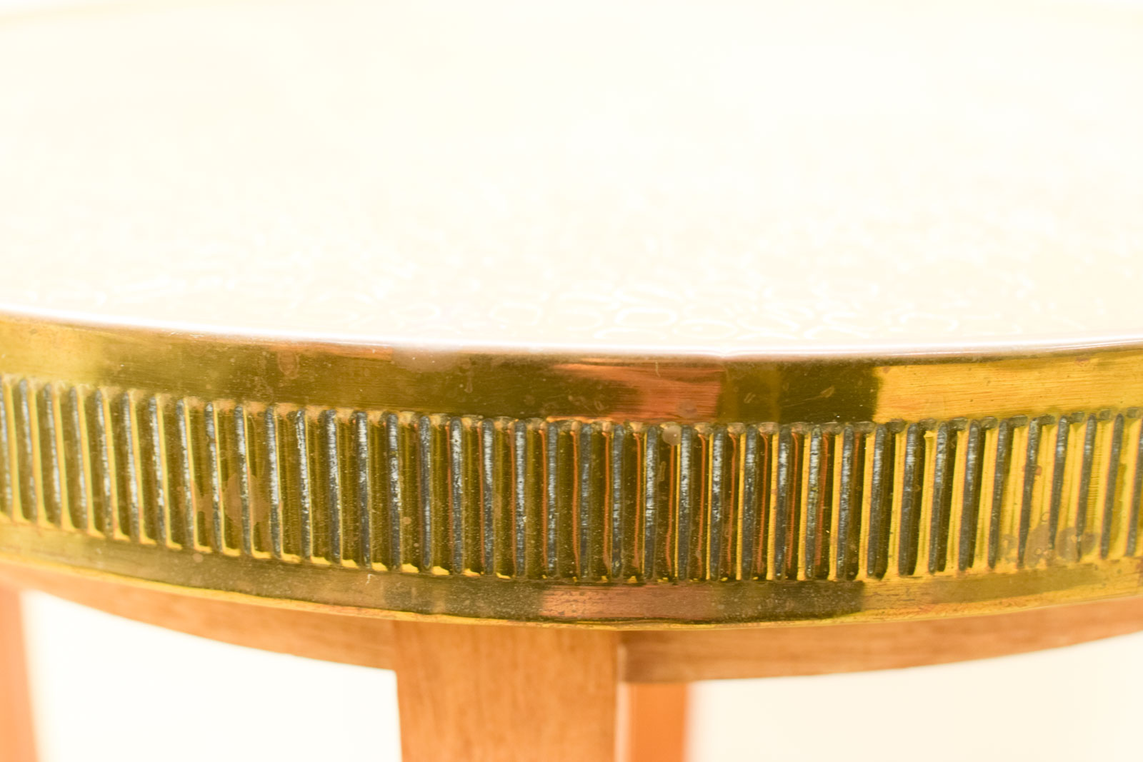 diameter bovenkant tafelblad 59,5 cm de tafelblad is verkleurd en heeft vlekken de bijzettafel heeft gebruiksporen maar is nog heel