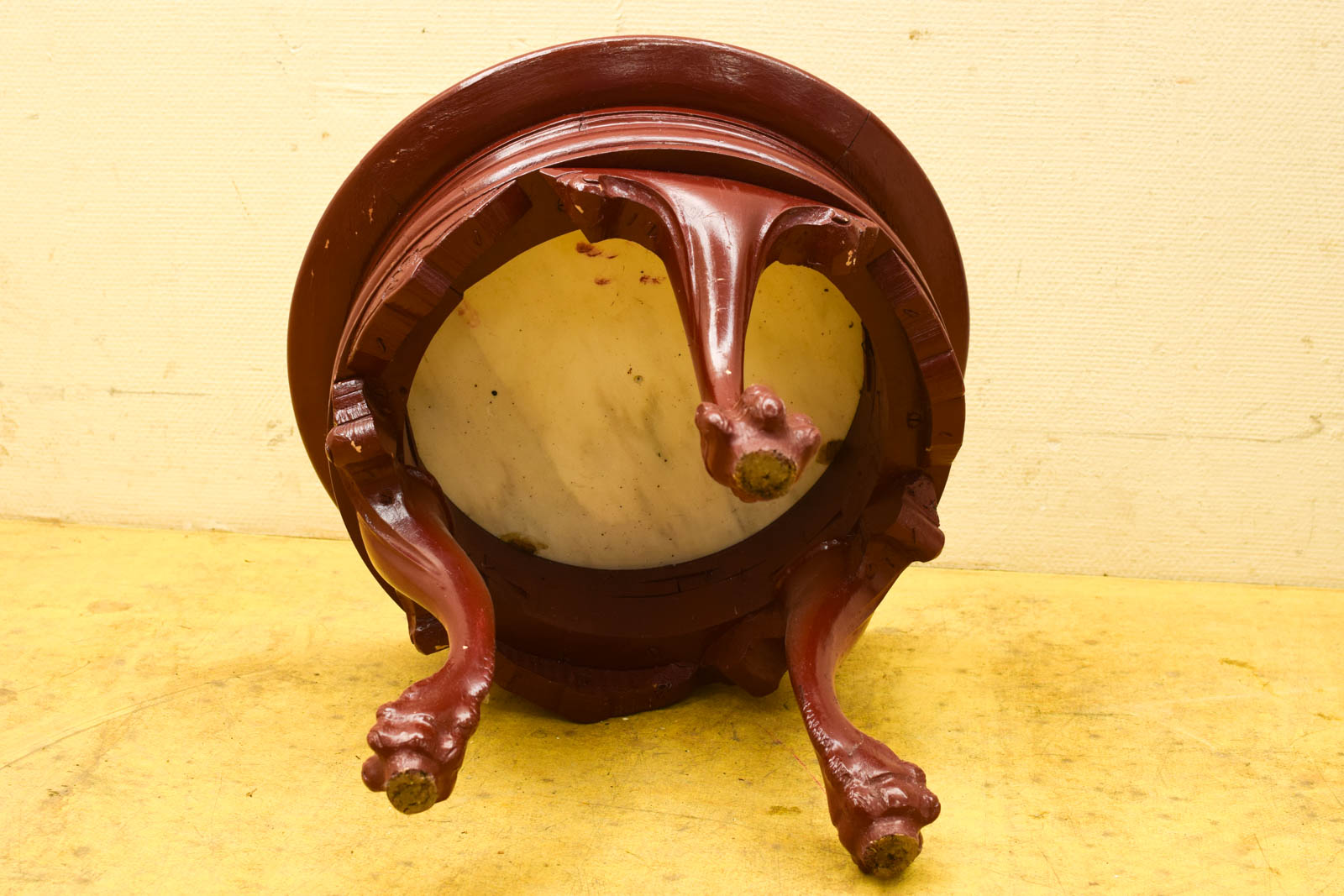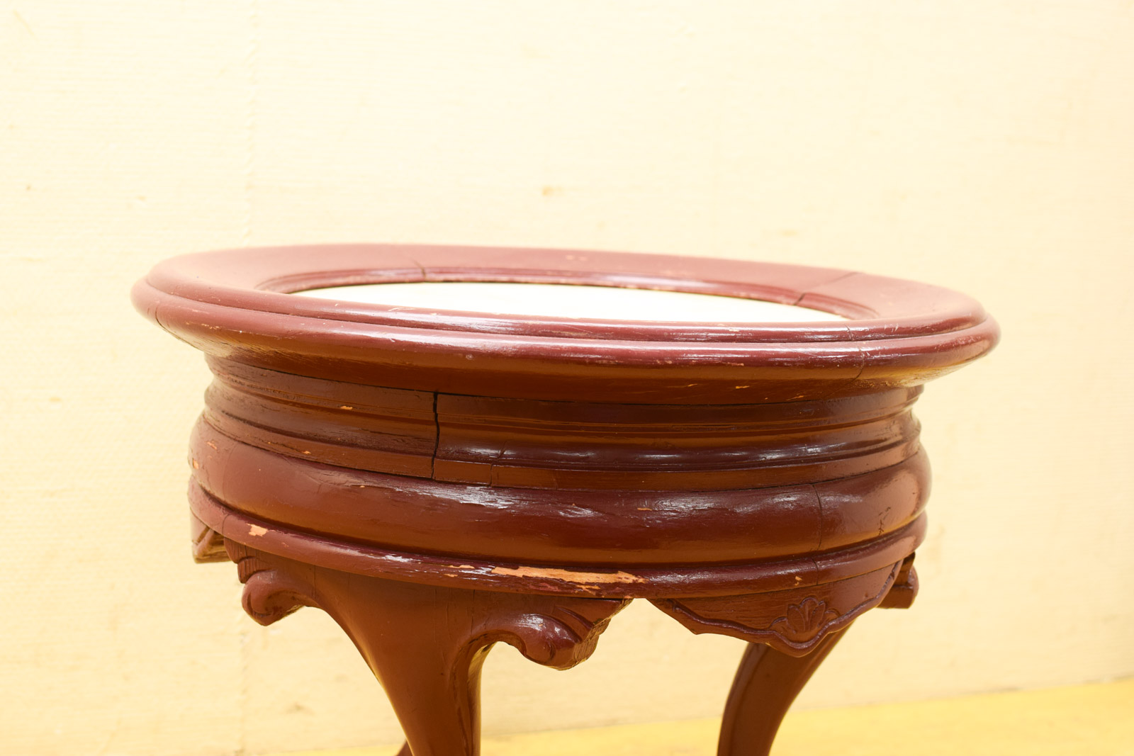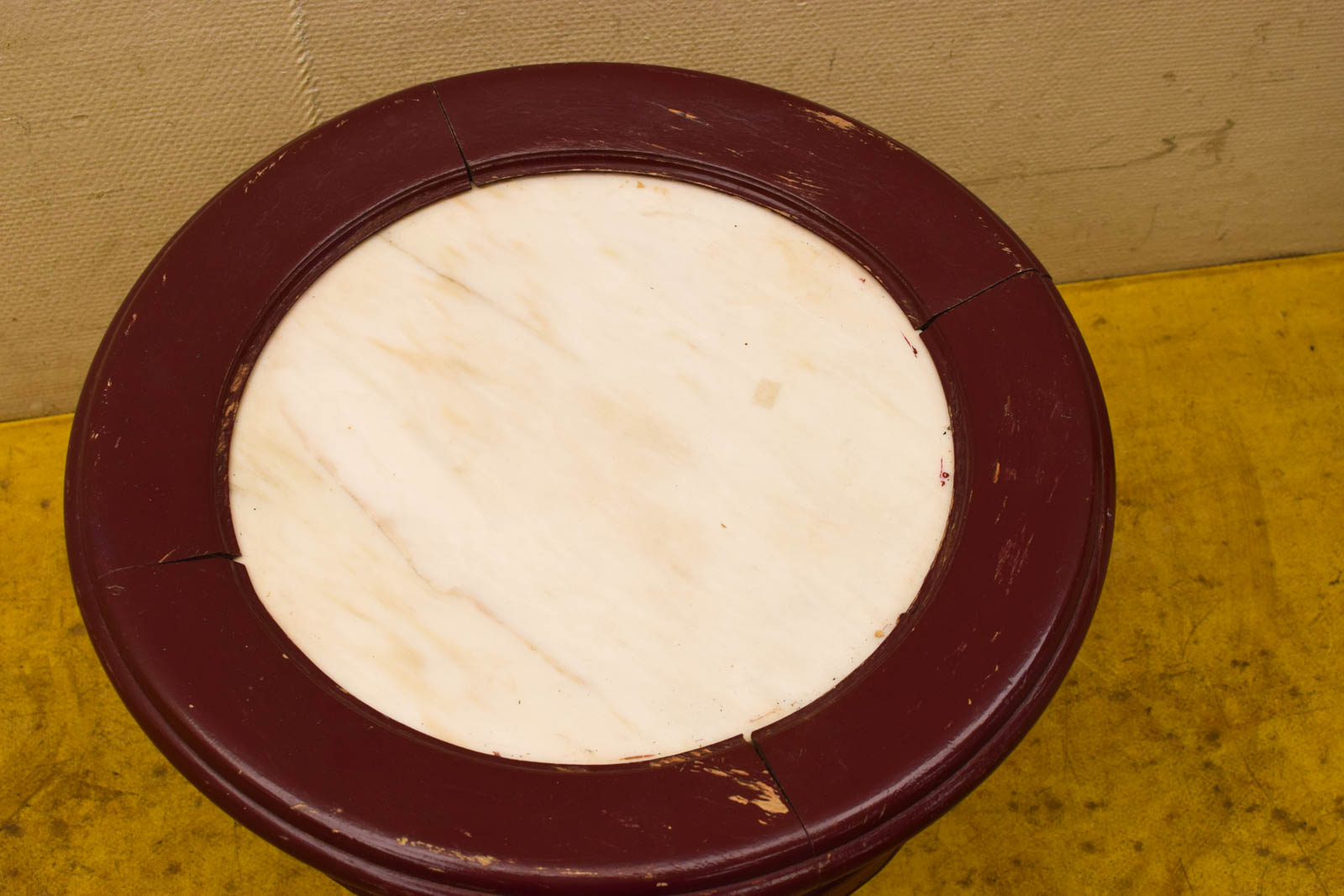 Het marmeren blad is heel en functioneel, maar vertoont verkleuringen en vlekken die je kunt zien op de foto’s. Het onderliggende hout heeft duidelijke gebruikssporen die je kunt zien op verschillende hoeken van het meubel. Dit is een product met geschiedenis, niet ongebruikt uit de winkel.