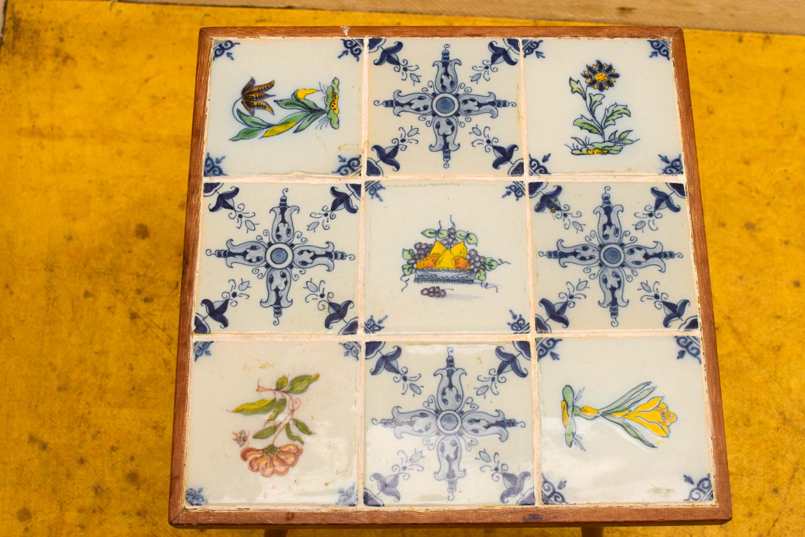 de tegeltjes zijn nog heel het tafeltje heeft gebruikssporen breed 33,5 cm diepte 33,5 cm hoog 37 cm