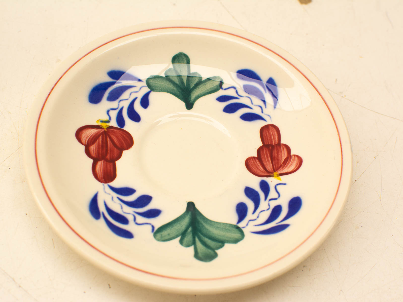 op de bodem van het kopje zijn een paar vlekjes diameter bovenkant kopjr 8 cm hoogte 7 cm diameter van het schoteltje 14,5 cm het kopje heeft wat slijtage op het verf