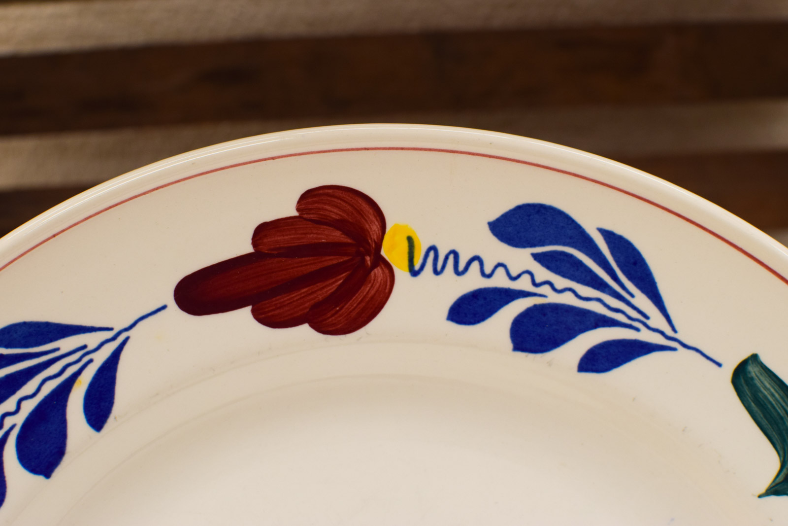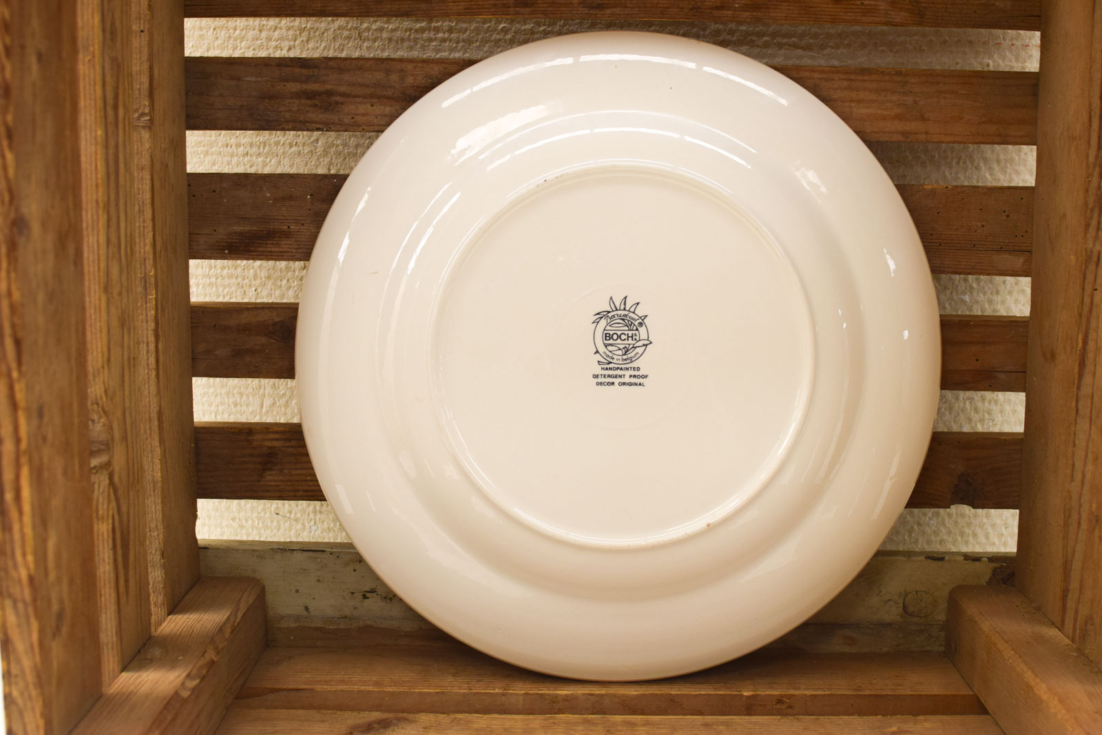 Boch Boerenbont porseleinen bord met diameter van 29,5 cm. Dit grote serviesbord heeft een klassiek decoratief ontwerp met rode bloemen en blauwe bladmotieven. Het bord heeft zichtbare krassen.