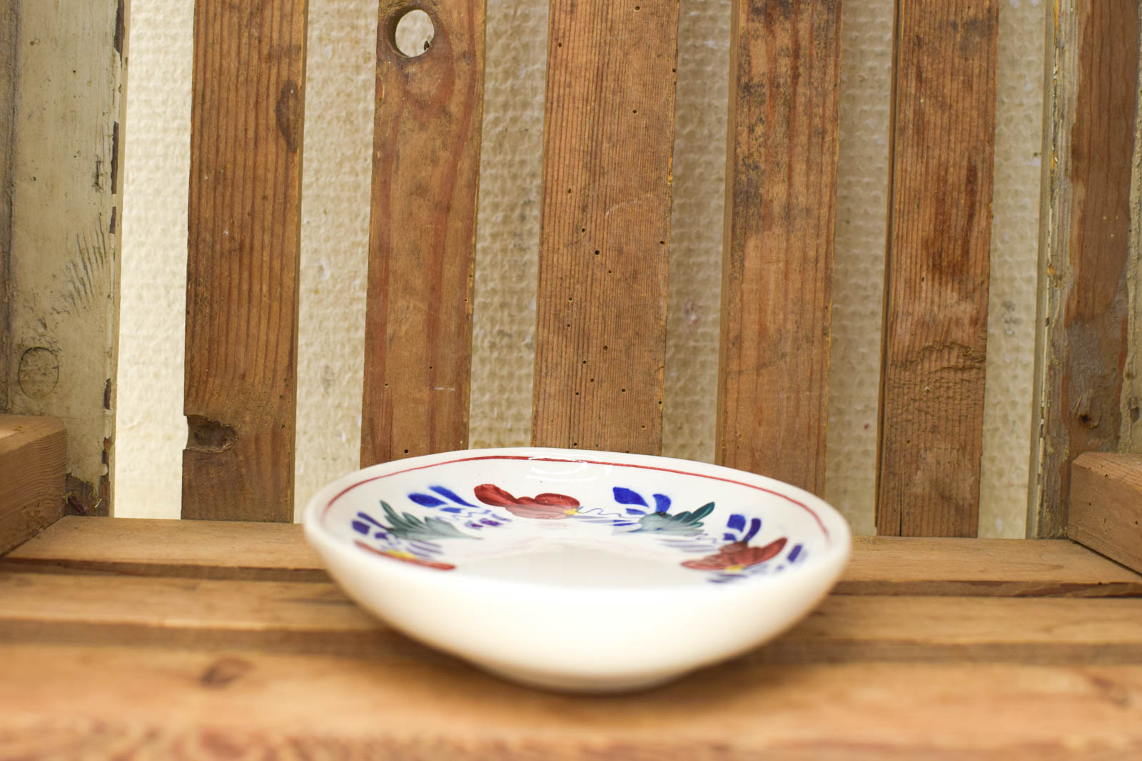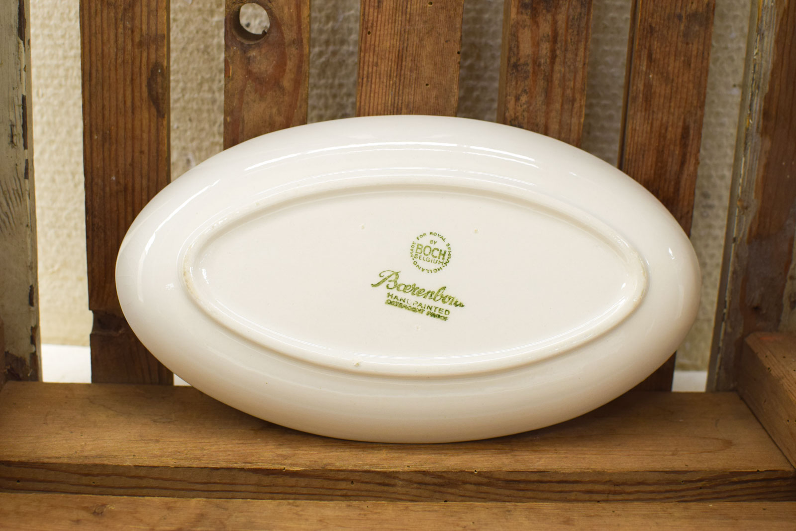 Deze porseleinen ovale schaal is van Boch, het bekende Nederlandse porseleinmerk dat sinds 1899 bekend staat om hun handbeschilderde tafelservies. Deze Boch Boerenbont porseleinen schaal toont het herkenbare patroon met rode bloemen, groene bladeren en blauwe twijgen op een wit fond, afgewerkt met een rood randje.