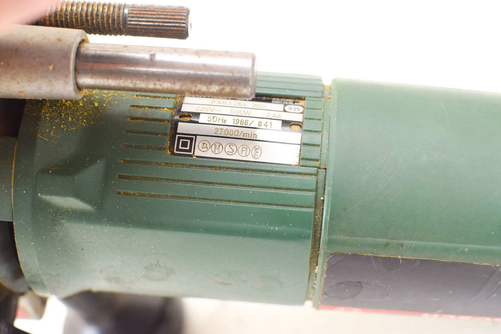 De machine heeft zichtbare gebruikssporen op het zwarte baseplate en de groene motor-housing — oppervlakkige krassen en wat aanslag, maar niets wat de functie aantast. De boring voor collet heeft wat oppervlakkige oxidatie. Het apparaat is getest en werkt zonder problemen. Meegeleverd zijn twee zwarte kunststof handgrepen aan de zijkanten voor veilige bediening. Afmetingen: ongeveer 25cm breed, 12cm diep en 26cm hoog.