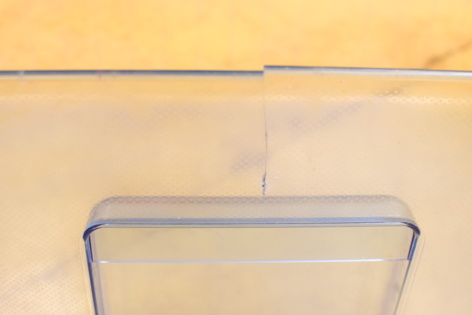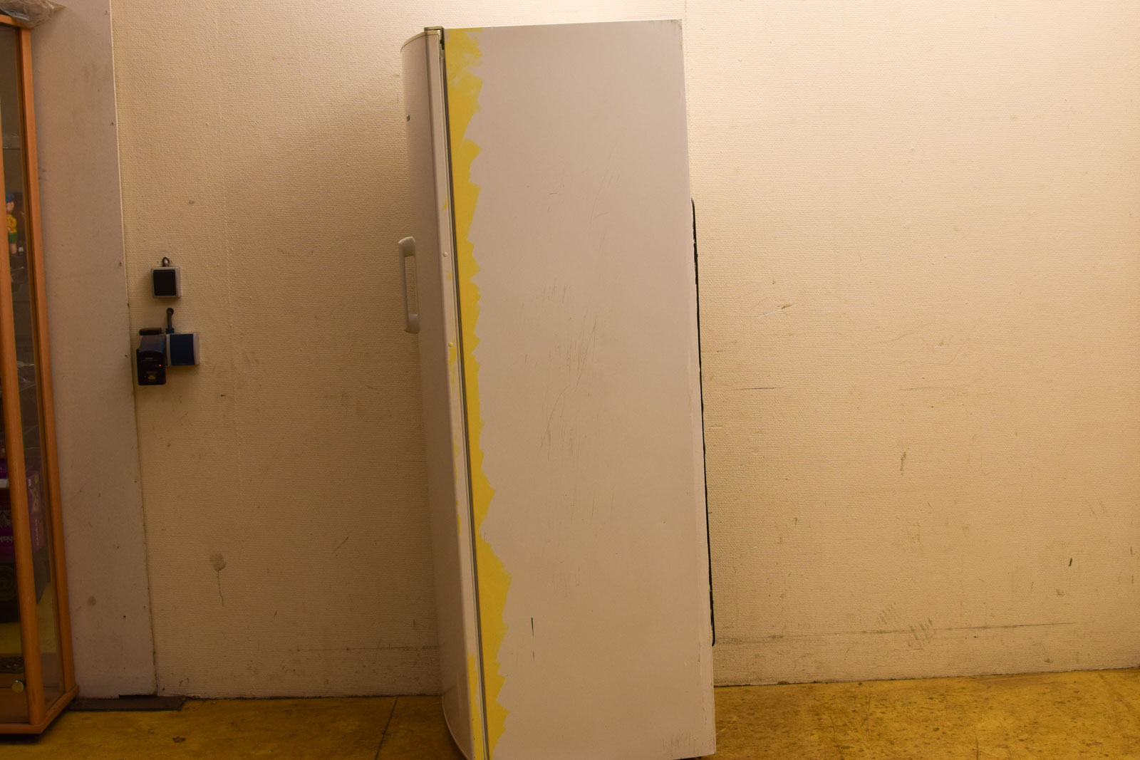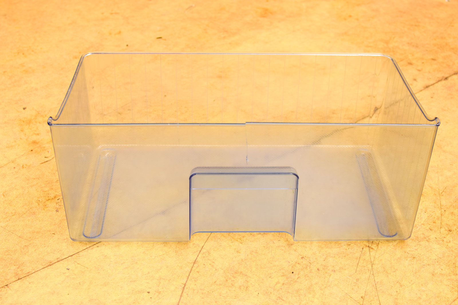 de plastic bak heeft een scheur aan de voorkant de koelkast heeft aan de buitenkant krassen en vlekken en deukjes aan 1 zijkant heeft de koelkast een gele streep