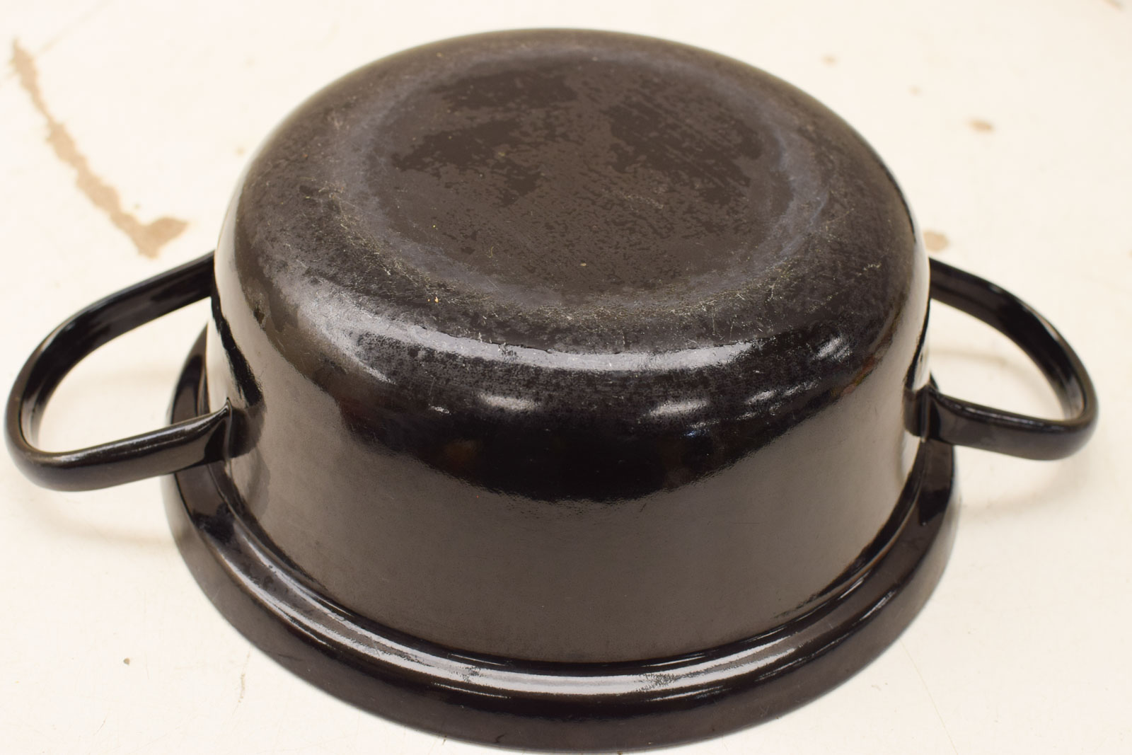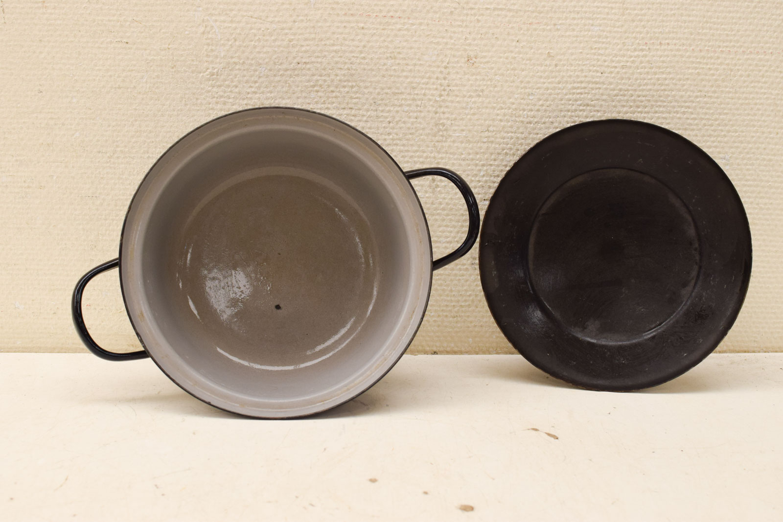 heeft roest op de deksel de pan heeft roestplekjes krassen en gebruikssporen gemeten van oor tot oor 34 cm gemeten zonder deksel hoog 10 cm