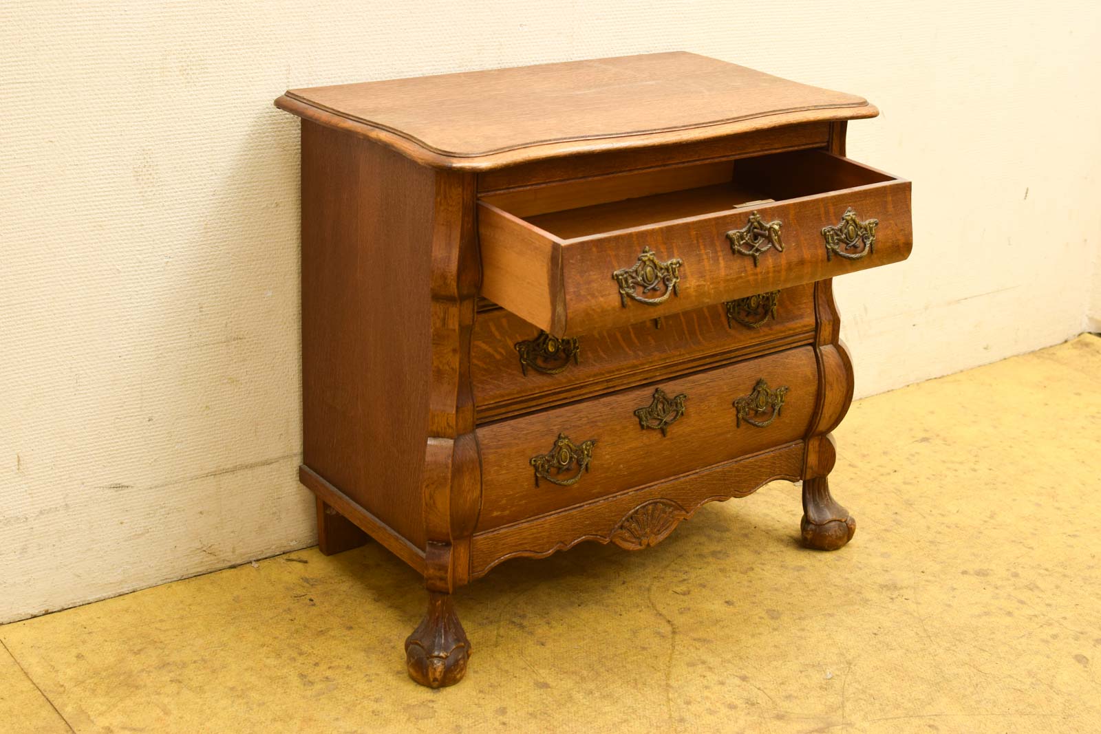 de kast is gebruikt en heeft gebruikssporen aan het hout de binnenmaat van de lade is breed 48 cm diepte 27 cm hoog 8 cm