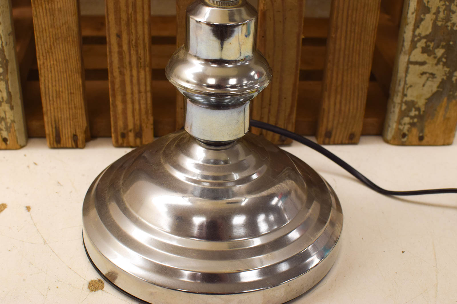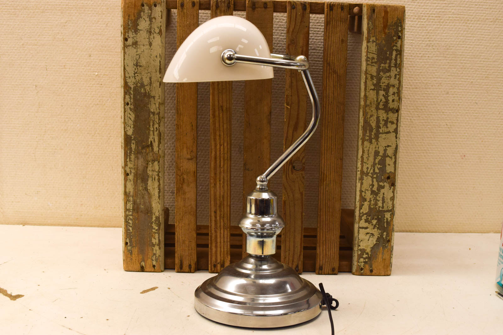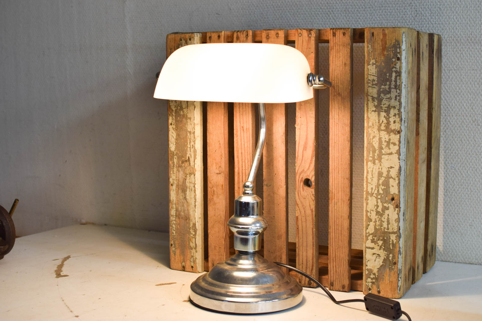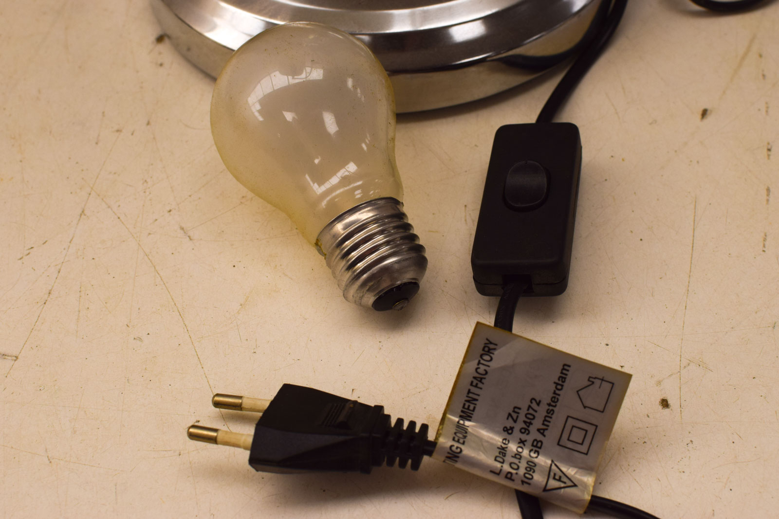 de kap is van glas en is heel de onderkant en hendel is van metaal de lamp heeft gebruikssporen bv vlekken maar is nog heel
