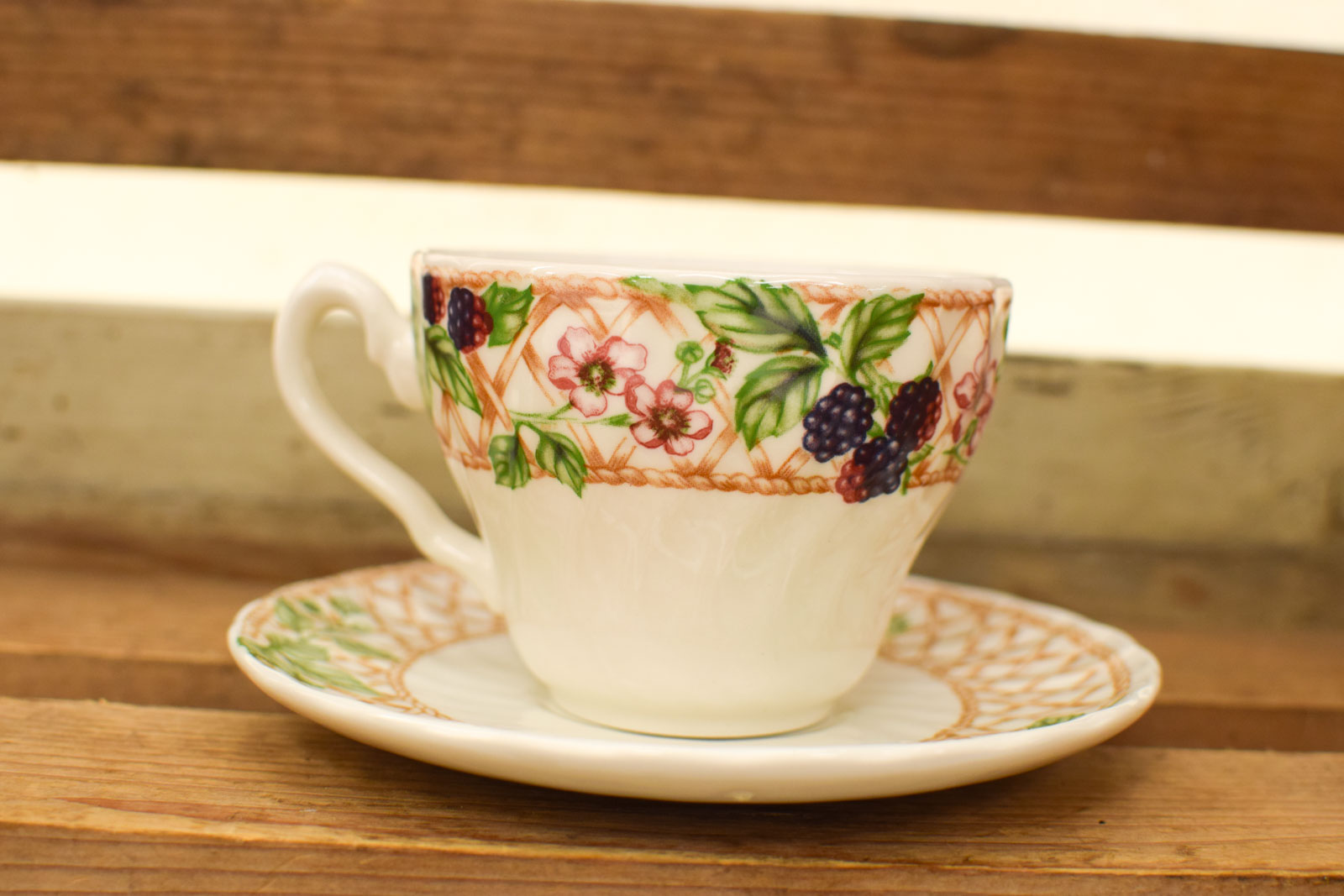 het kopje gemeten diameter bovenkant opening van het kopje 8 cm hoog 6 cm diameter van het schaaltje 12,5 cm ziet er nog redelijk uit