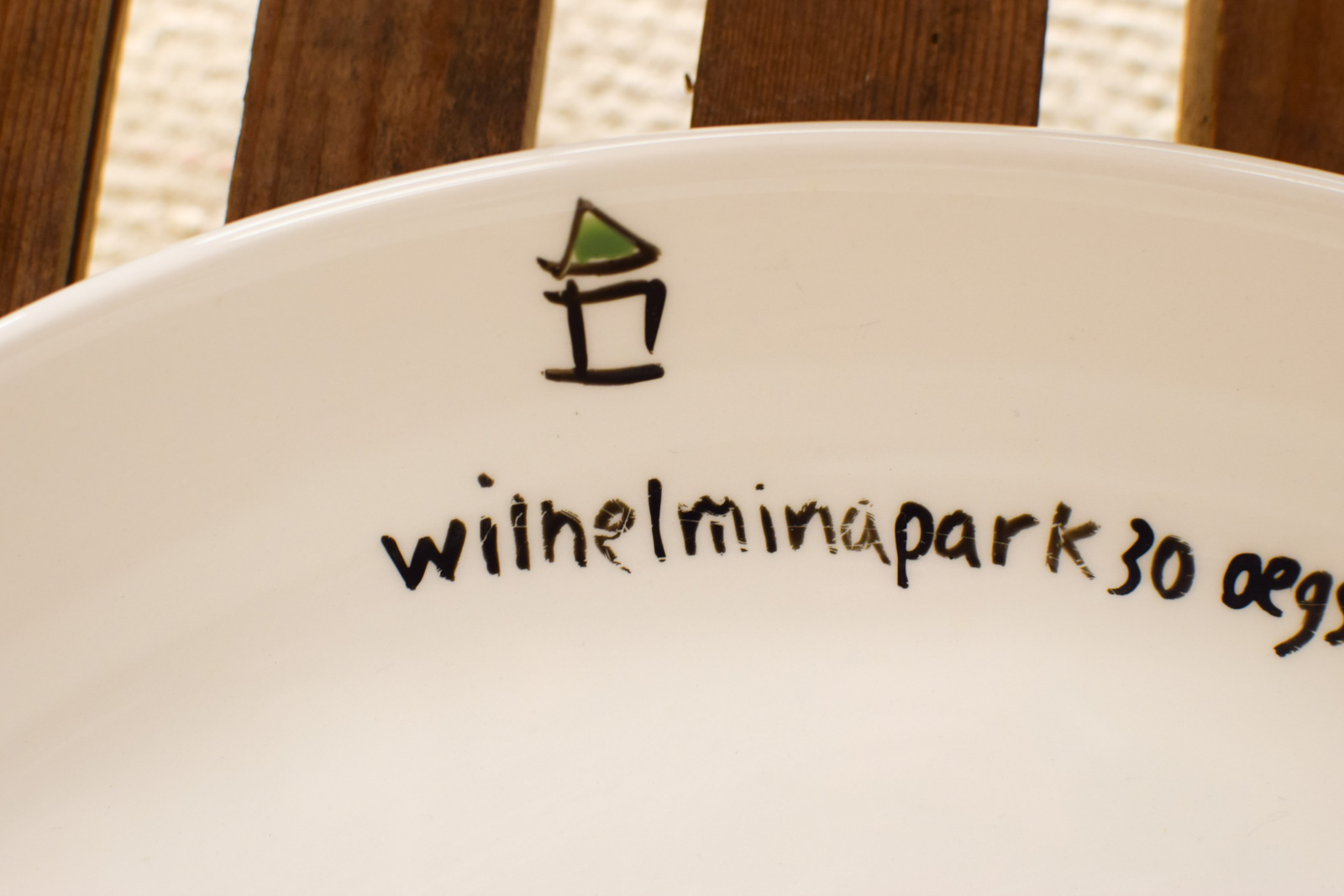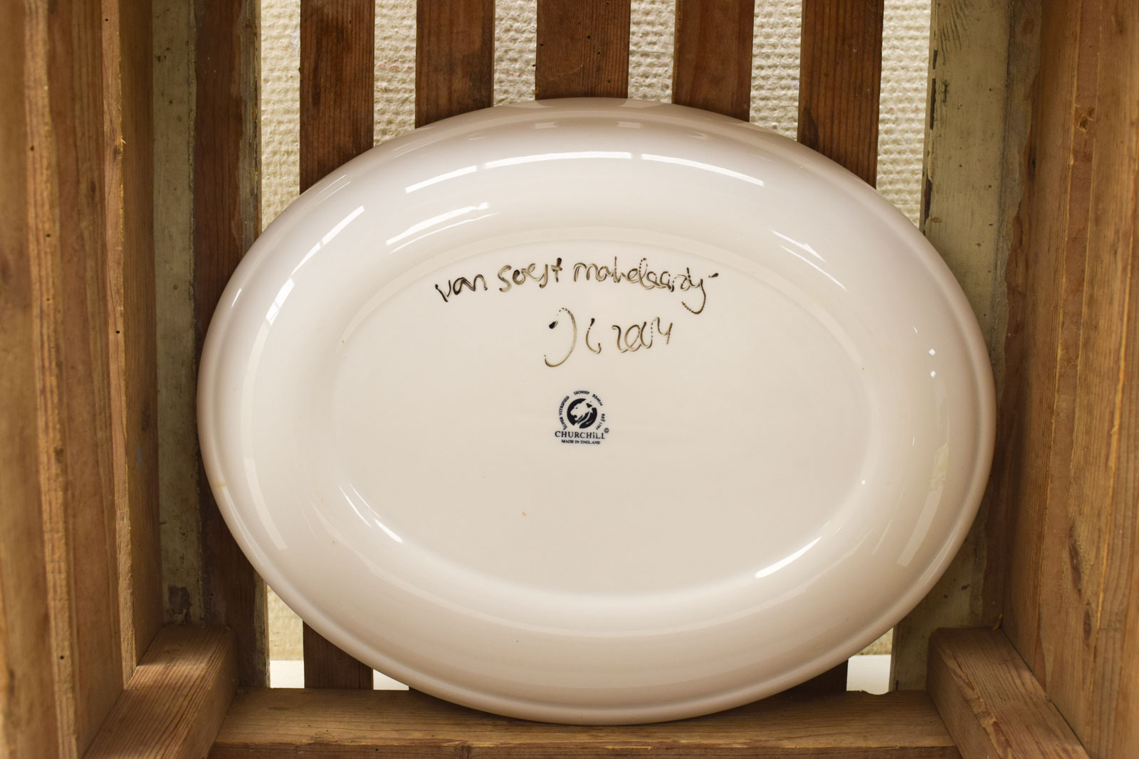 Deze Churchill porseleinen ovale schaal is een leuke vondst voor wie van vintage servies houdt. Het oppervlak is voorzien van handgetekend decor: de tekst ‘wilhelminapark 30 oegstgeest’ staat in het midden, omringd door kleine huisjes en andere vormgeving in groen, zwart en rood. Het ontwerp geeft de schaal een persoonlijk, nostalgisch karakter.