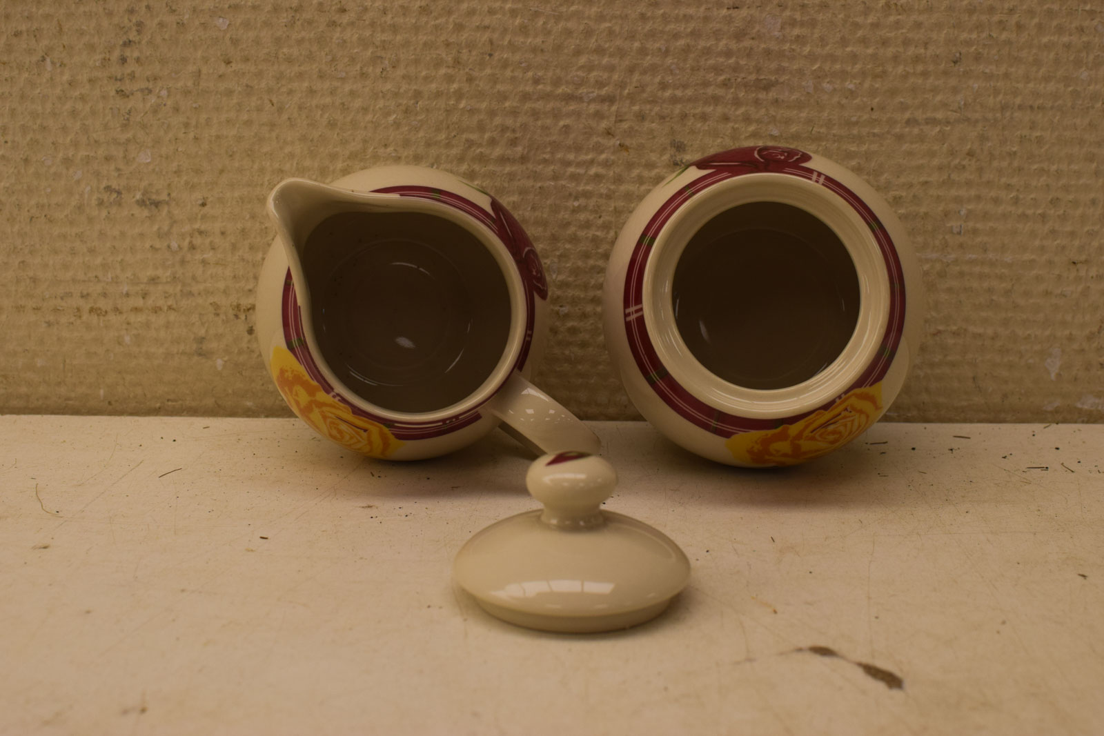 suikerpotje gemeten diameter bovenkant 6,5 cm gemeten onder deksel 8 cm melkkannetje gemeten van oor tot tuit 11,5 cm hoog 7,5 cm het servies ziet er nog redelijk uit