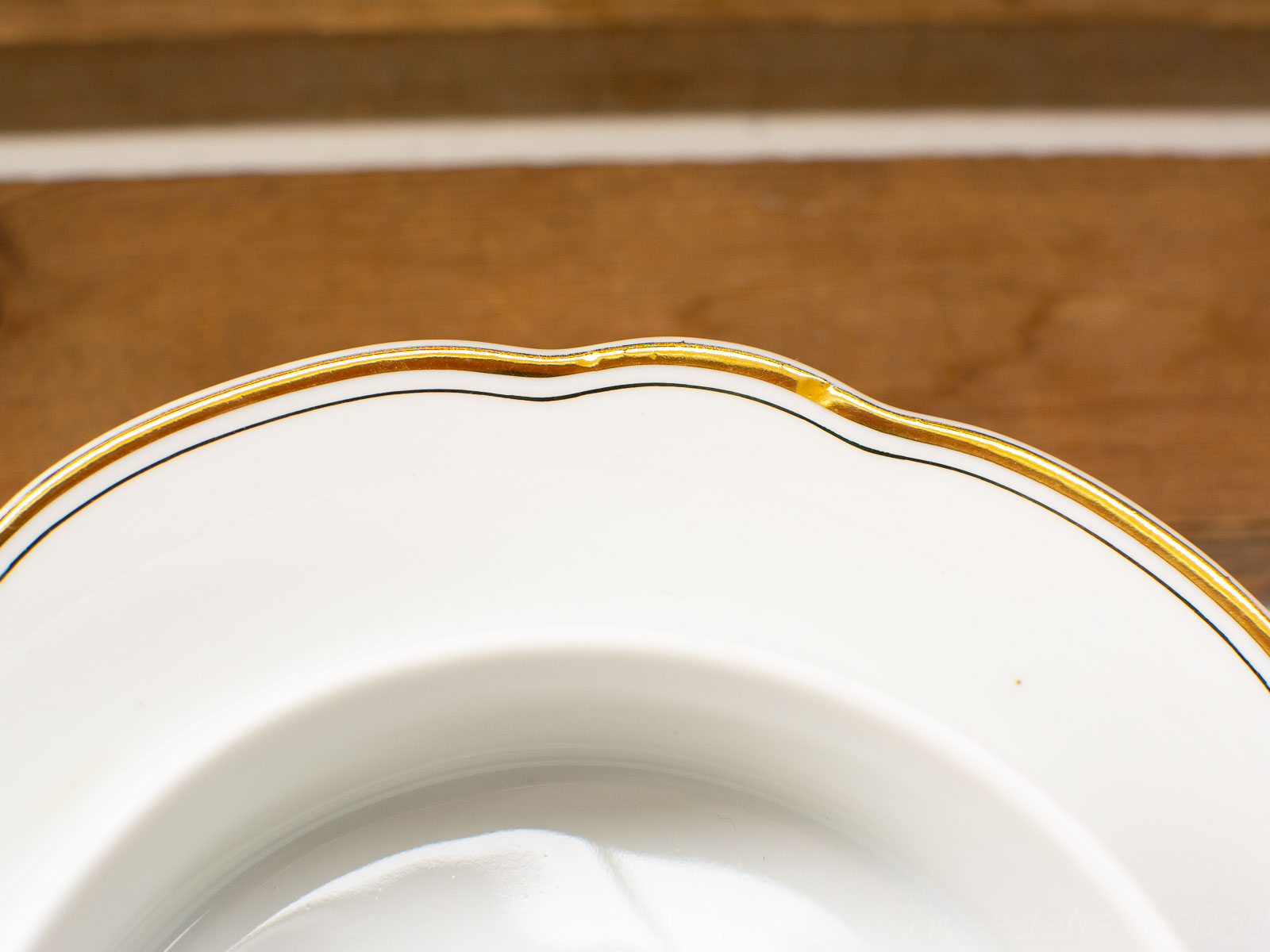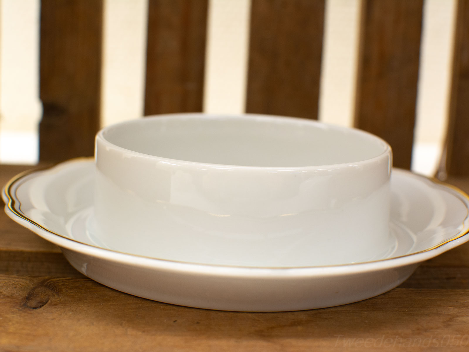 het goudgelkeurde randje heeft wat slijtage op het verf diameter van het bakje 10,5 cm de botervloot ziet er verder nog goed uit