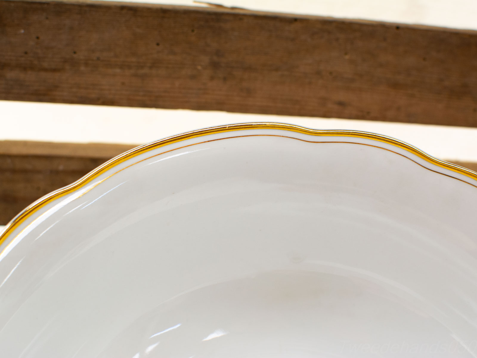 de schaal heeft een goudkleurige randje en die heeft wat slijtage de schaal heeft wat vlekken en krassen diameter bovenkant van de schaal 23,5 cm hoog 6,5 cm