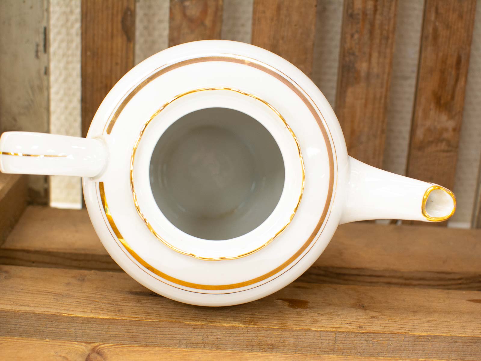 de pot heeft goudgekleurde randjes die wat slijtage hebben op het verf de theepot ziet heeft een klein beetje aanslag aan de binnenkant gemeten van oor tot tuit 23 cm hoogte gemeten zonder deksel 15 cm