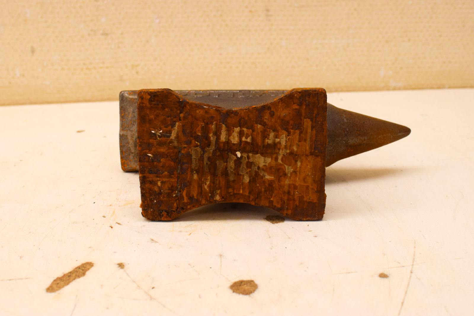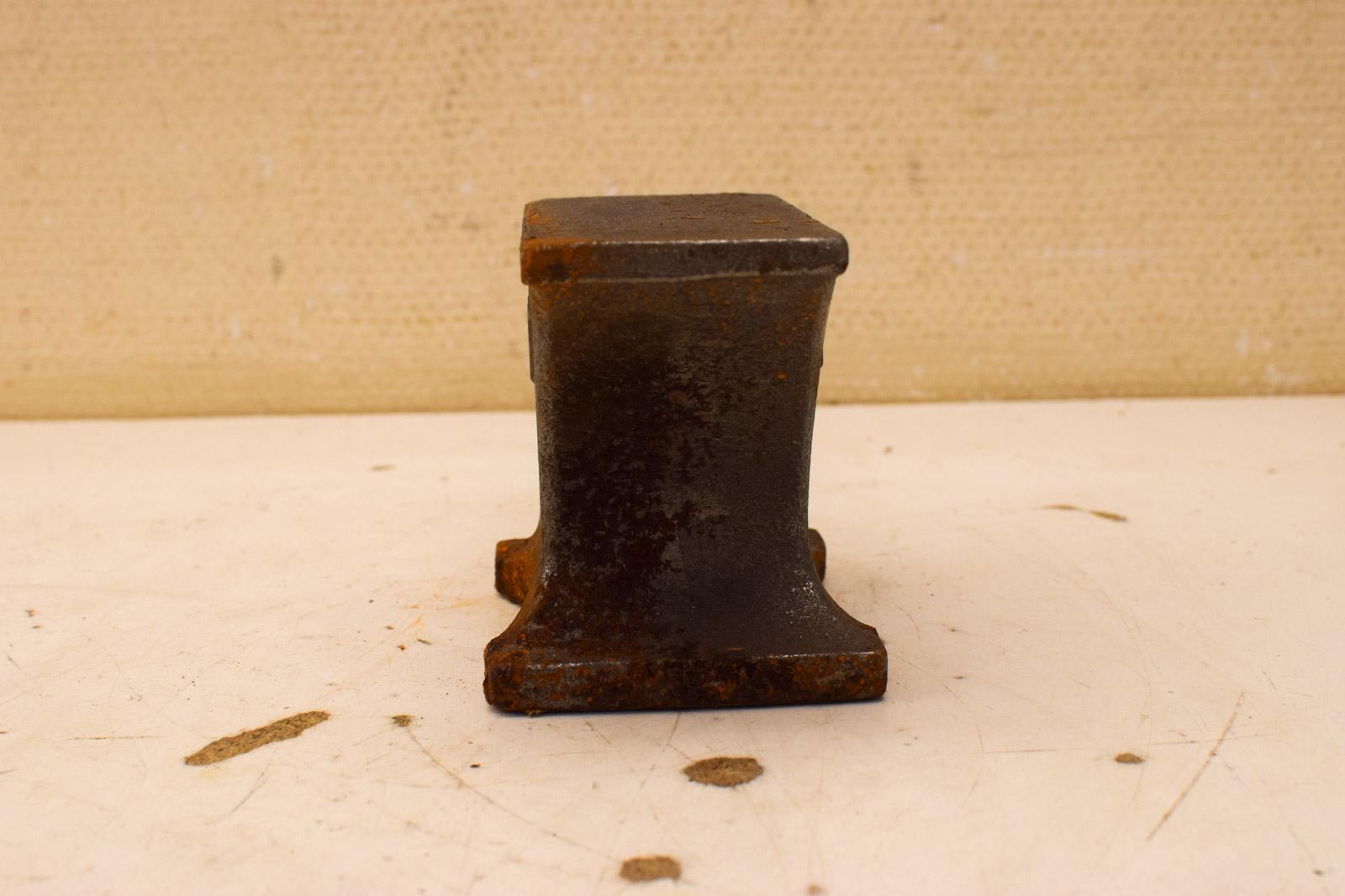 Het aambeeld vertoont roest op het oppervlak, wat typisch is voor gietijzeren gereedschappen van deze leeftijd. De patina en gebruikssporen geven aan dat dit een werktuig is dat daadwerkelijk gebruikt is. Dit beperkt de functionaliteit niet, maar vraagt wel voorbereiding als je het gaat inzetten: reinigen en oliën behoort tot het normale onderhoud van gietijzer.
