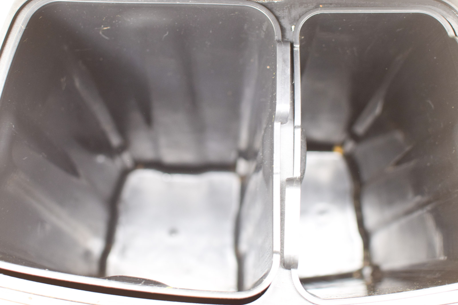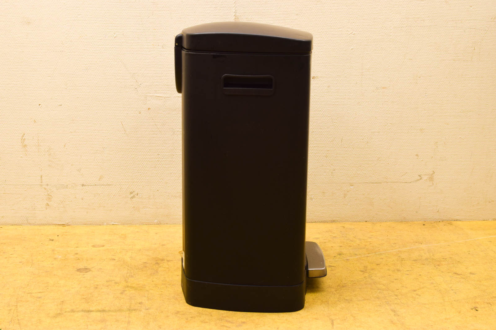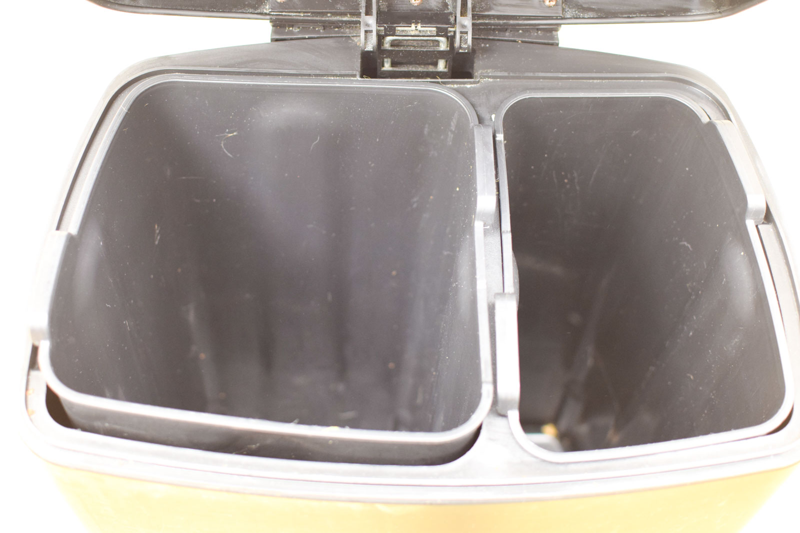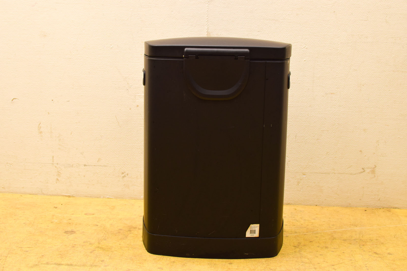 Zwarte duo prullenbak met pedaal en twee afneembare binnenemmers. Gebruikt exemplaar met normale gebruikssporen, maar volledig functioneel. Afmetingen: 63,5 x 46,5 x 32 cm.