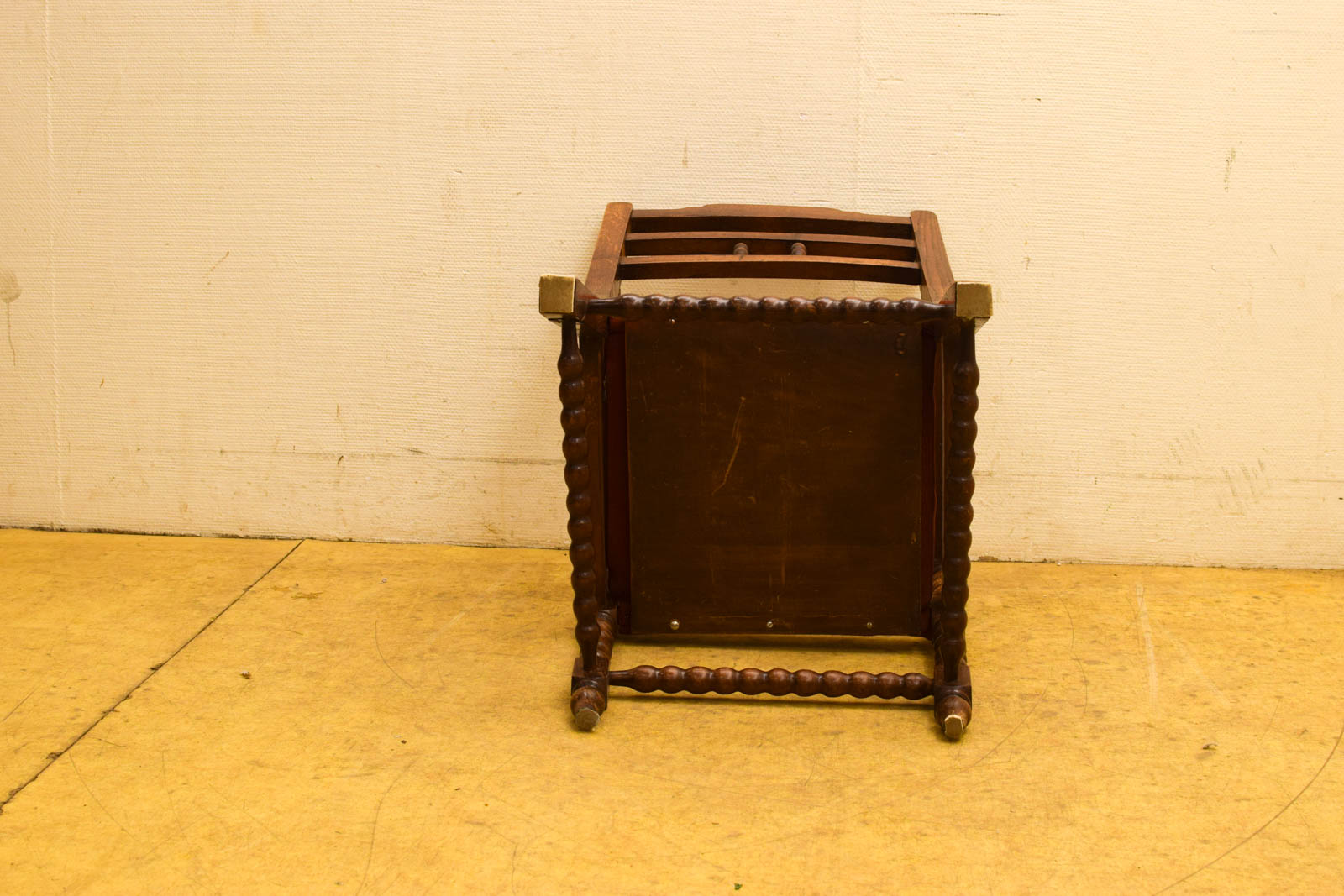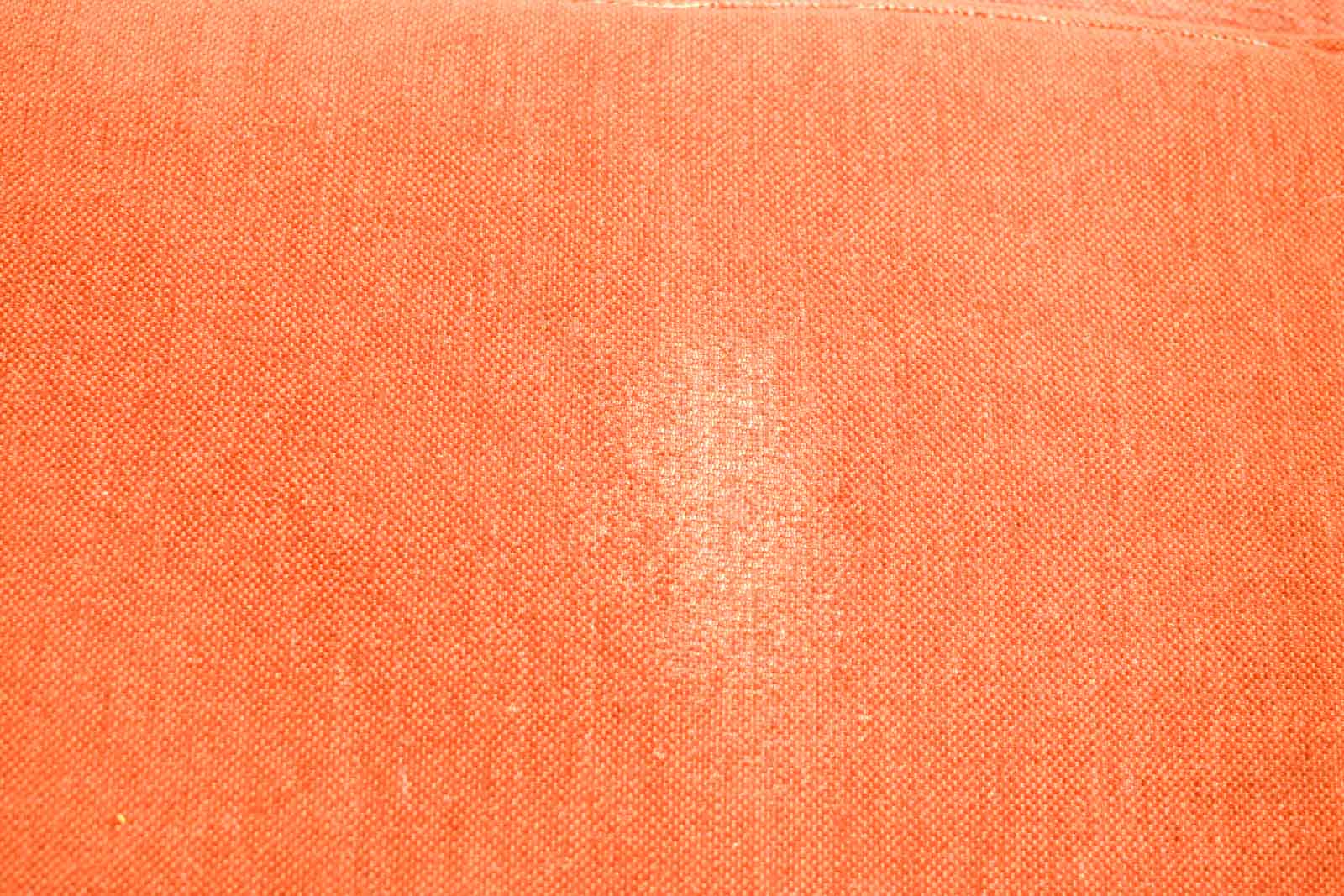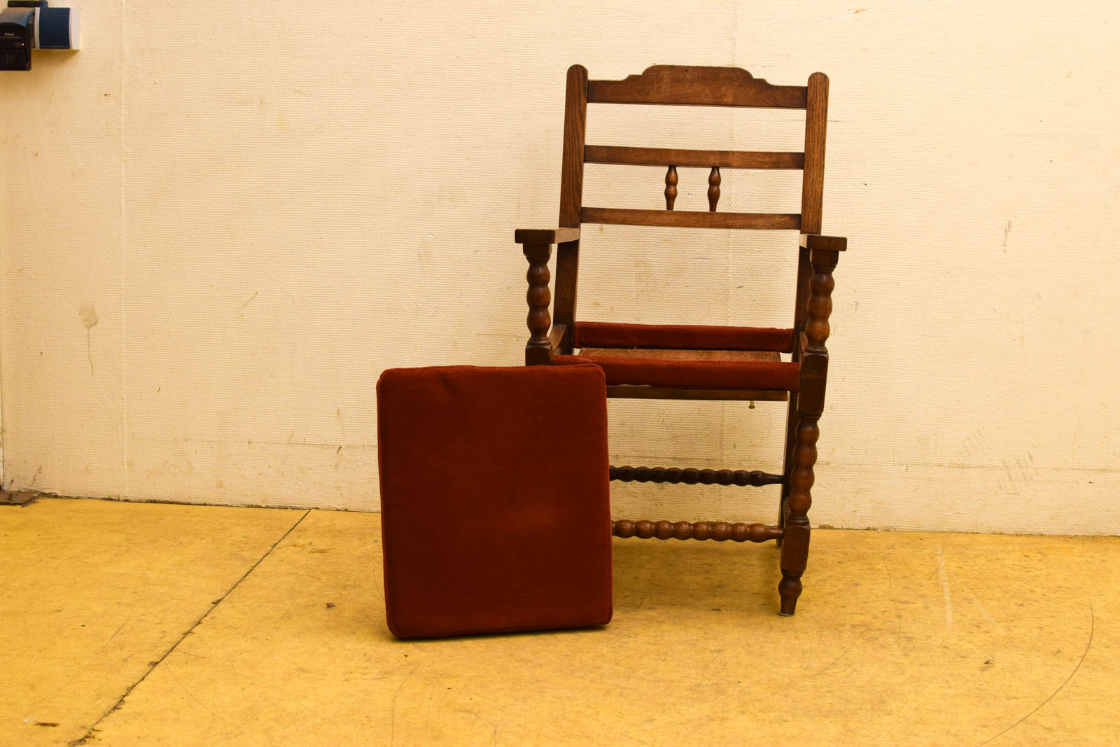 De stoel toont gebruikssporen zoals je mag verwachten van een tweedehandsartikel. Het stofje is weliswaar heel en intact, maar heeft een zichtbare vlek die je op de detailfoto kan zien. Dit beperkt de esthetische perfectie, maar beide de structuur van de stoel en het weefsel van het stofje zijn goed bewaard gebleven.